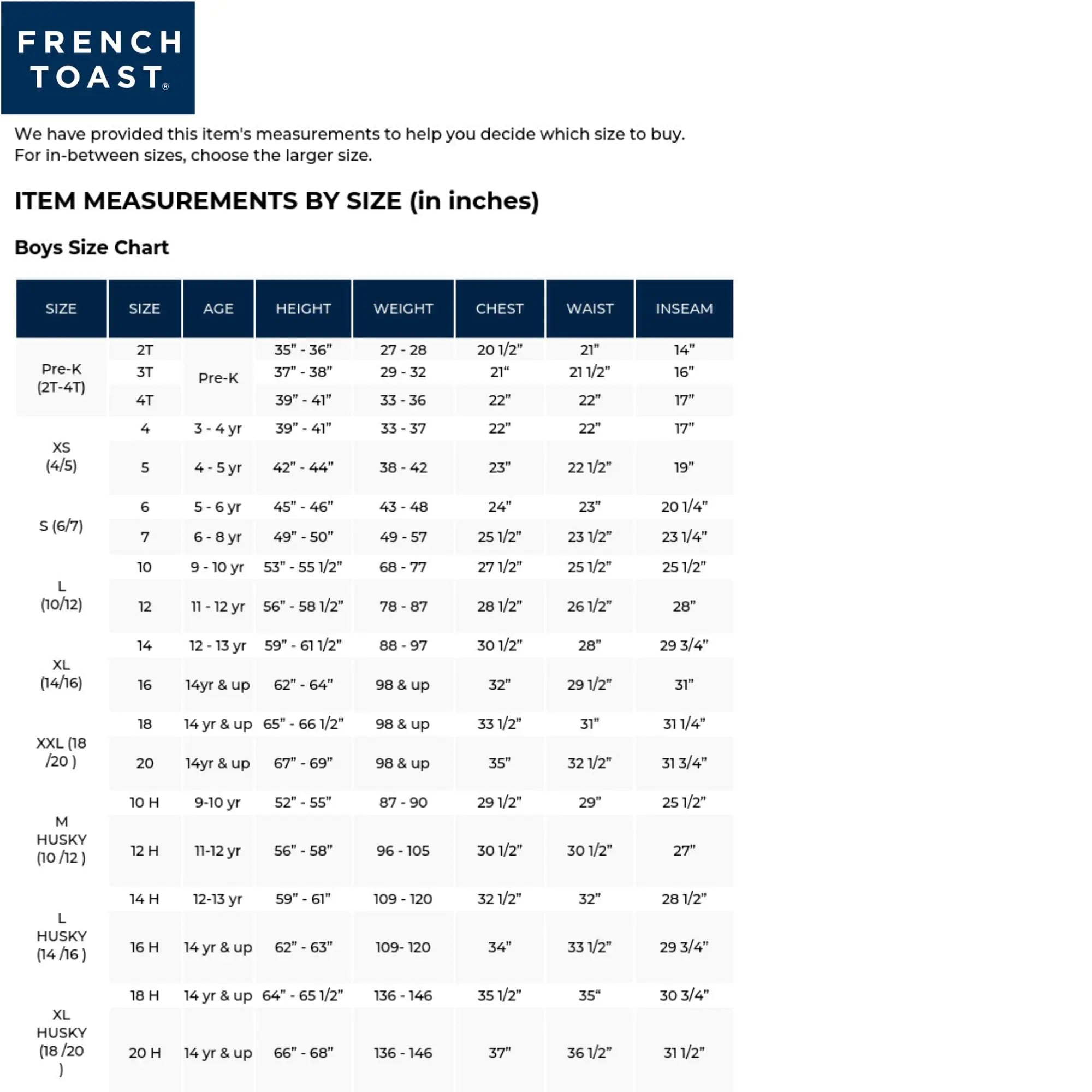 These wear-with-anything chinos are a fresh alternative to dress pants and jeans. Made in cotton-blend twill with long-lasting stretch comfort, they have an adjustable waist that ensures a room-to-grow fit. A kids-centric, national brand, French Toast delivers comfort that lasts. We do this with great versatile basics and casual styles that every kid needs every day. With the costs of school clothing for children on the rise, French Toast offers clothing that was designed to stretch the dollar and made with quality that lasts.
