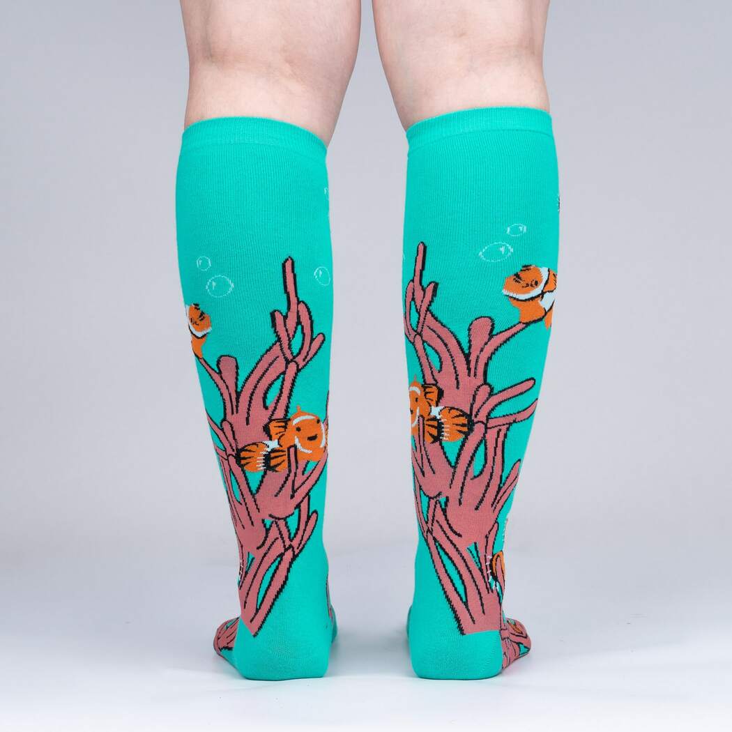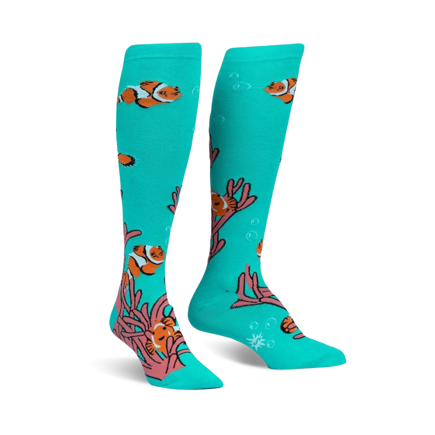 Diving into the deep blue sea of fashion, our Friends with Benefish socks will have you bobbing and weaving with delight! Picture this: a radiant teal canvas adorned with a whimsical parade of cartoon clownfish and pink and orange sea anemones a true spectacle for the feet! Slip into these knee-high wonders, and you'll be the talk of the tide pool, leaving everyone in your wake green with envy! Like a graceful mermaid or majestic sea turtle, you'll glide through your day with newfound confidence, knowing that your feet are the catch of the day!