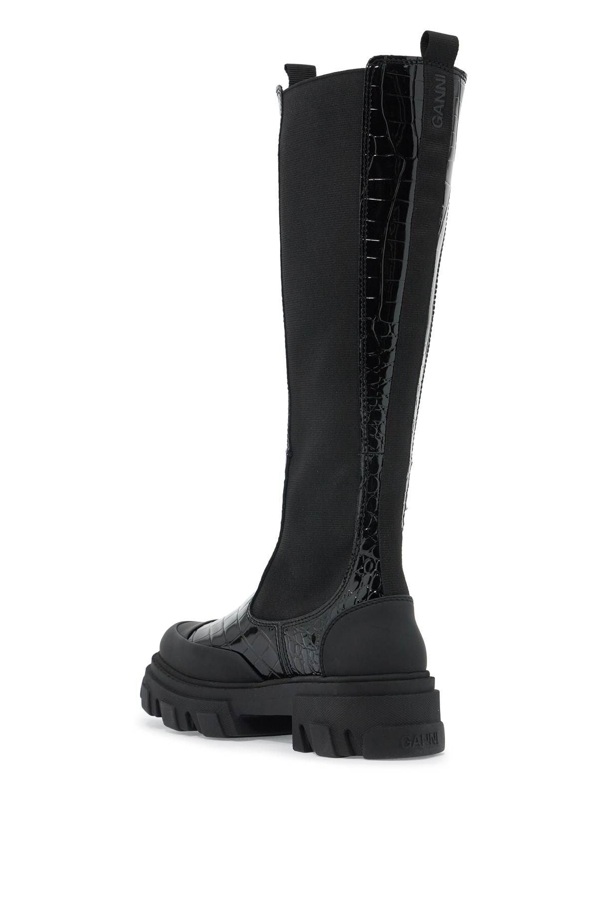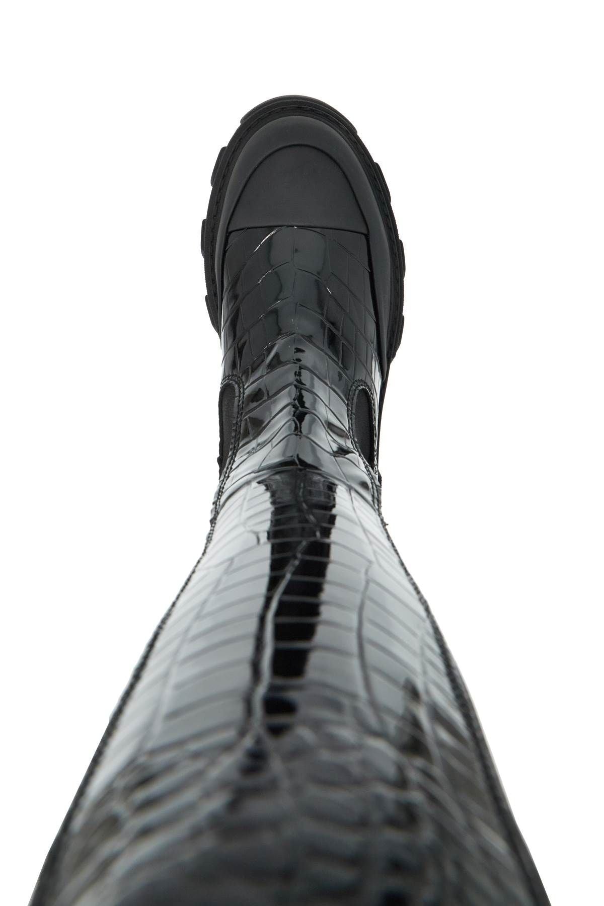 Ganni's Chelsea boots are made of crocodile print ecovernice with grosgrain straps and a chunky sole. The interior is lined with fabric and the sole is made of rubber.