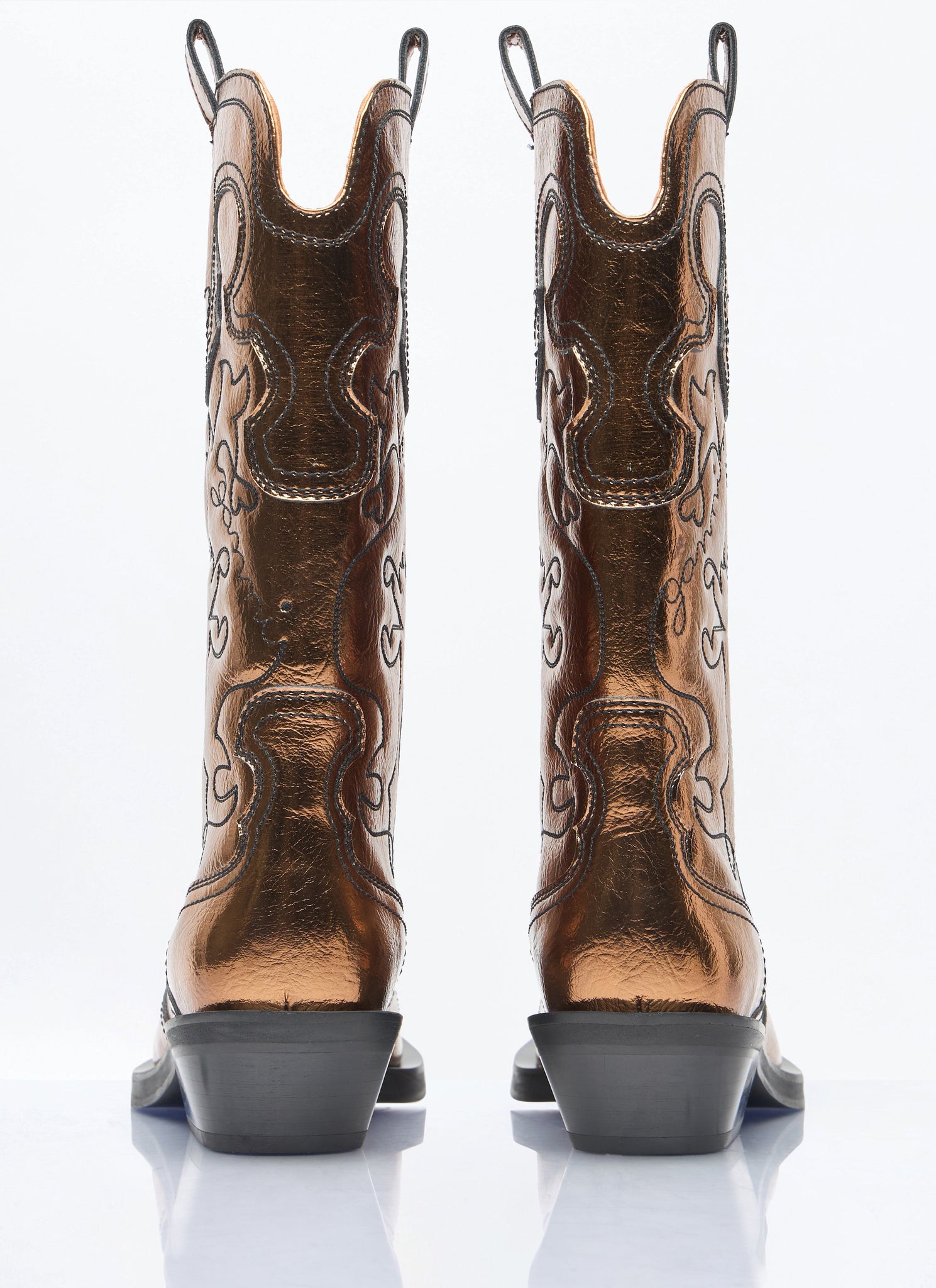 Mid shaft embroidered western boots in faux leather with metallic finish.