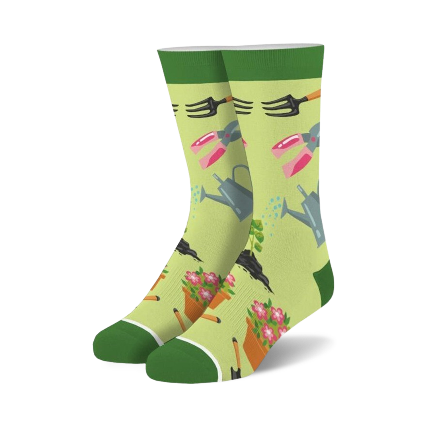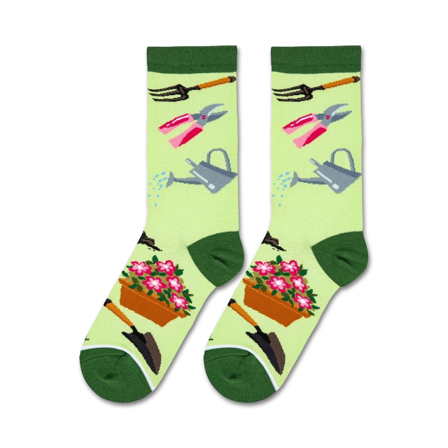 Calling all green thumbs! Get ready to plant the seed of style with our new crew socks. Featuring a delightful pattern of gardening tools and vibrant blooms on a verdant backdrop, these socks will have you digging for more. Whether you're a backyard botanist or an urban jungle dweller, these socks will add a touch of fun and flair to your everyday wear. Just be prepared for compliments to blossom wherever you go!