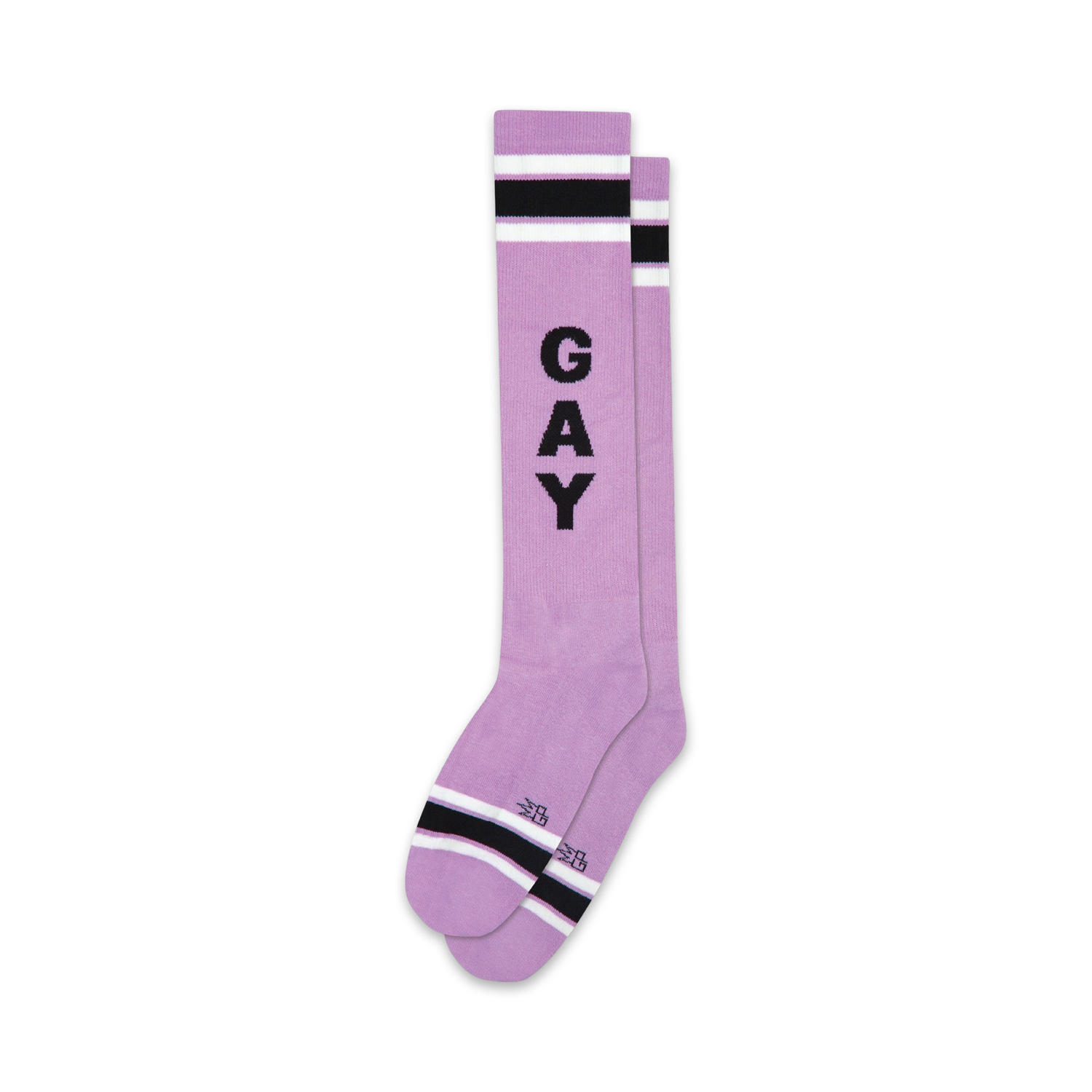 Pride-themed knee-high socks? Gay and extra cozy! Radiate gayosity and flaunt your pride boldly with our socks that scream GAY in black letters. The vibrant lavender color and playful stripes make them a fun fashion statement. Whether you're strutting down the street or just lounging at home, these socks will keep your feet happy and stylish.