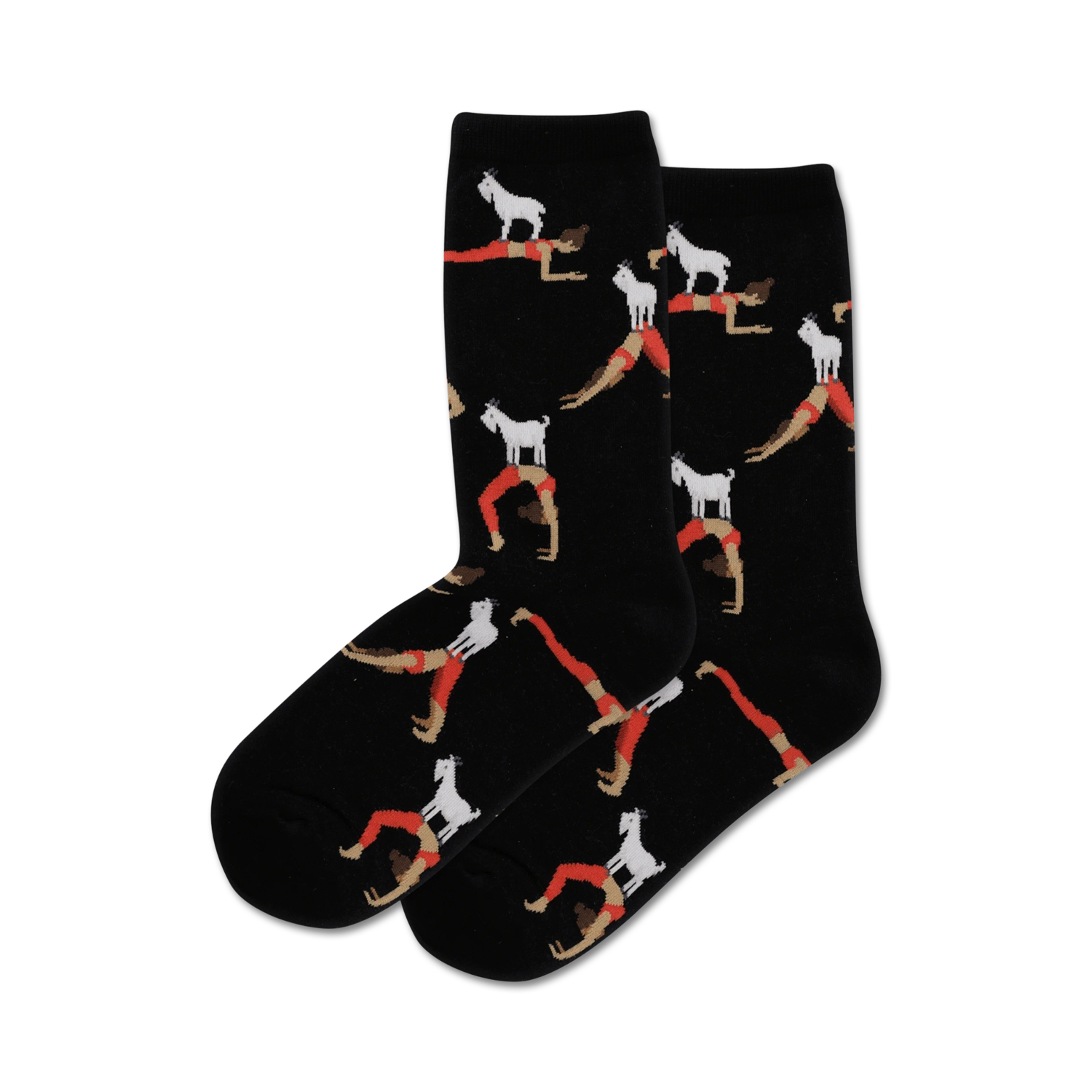 Stand tall in your style with these Goat Yoga socks! These crew-length, black socks feature a quirky pattern of orange goats striking various yoga poses. Channel the inner peace of these flexible goats and keep your feet cozy in these fun and unique socks you've goat to try them!