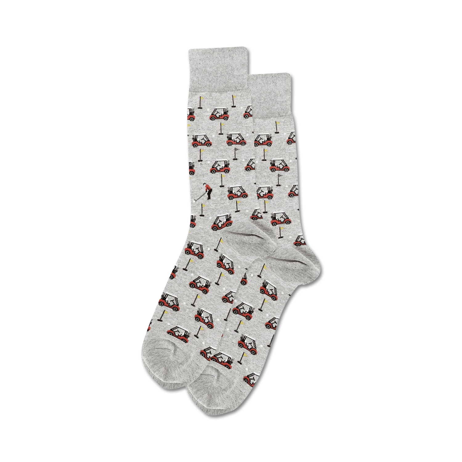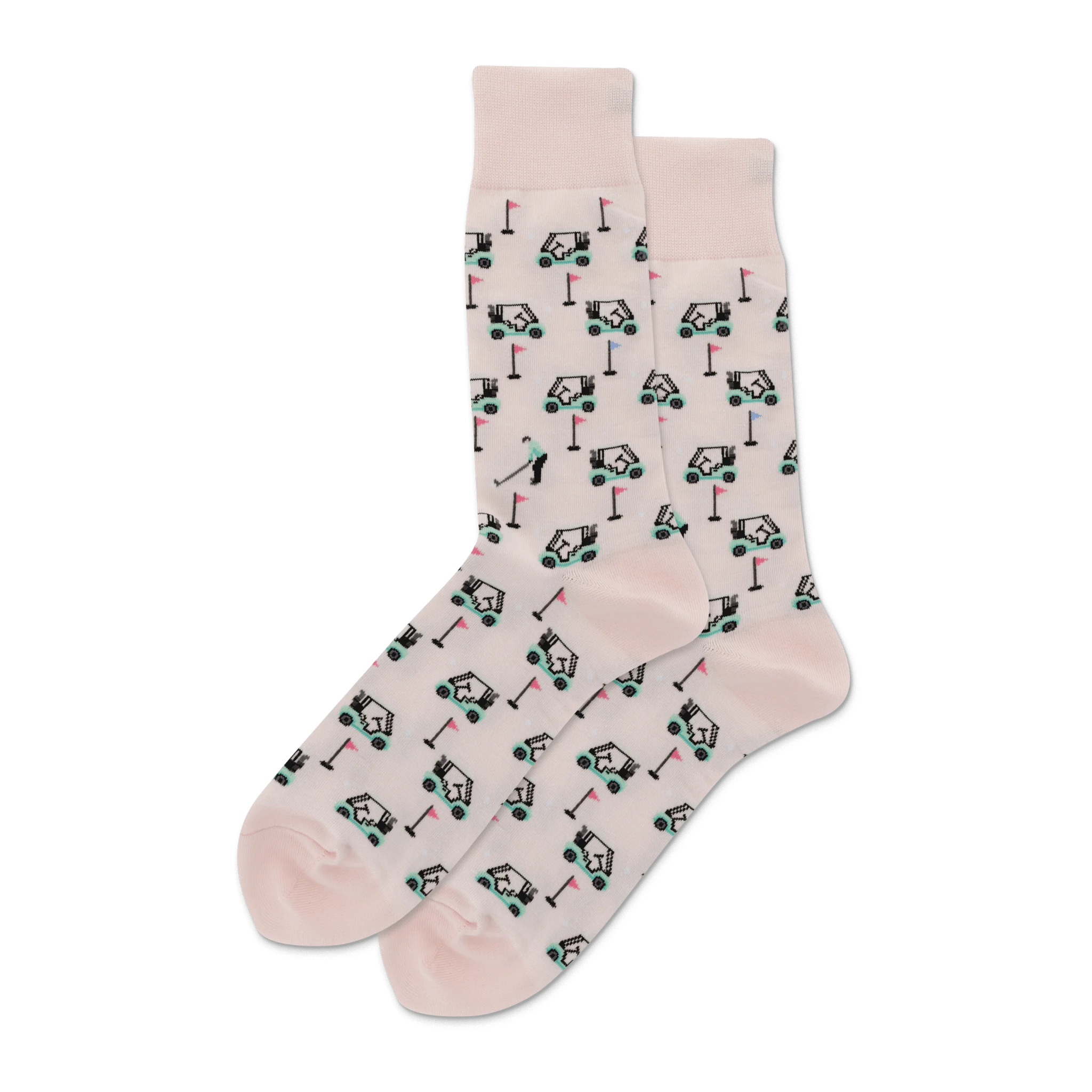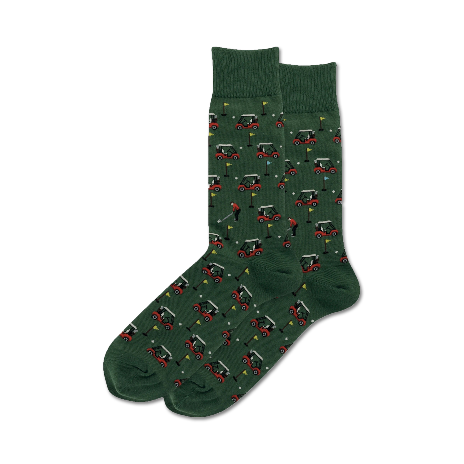 Green and wild, these golf cart socks are the perfectly "fore"some finishing touch to any golfer's look. Featuring a pattern of joyous red golf carts, pristine white golf flags, and the occasional player taking a swing, these crew length socks are a hole-in-one. You just can't putt them down!