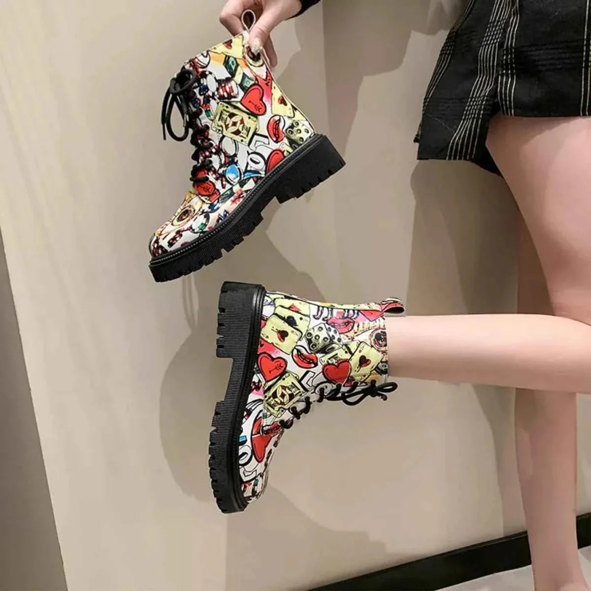 Stand out in the crowd with these graffiti print combat boots featuring a colorful street art design. The vibrant hues and intricate patterns are sure to catch everyone's attention. Whether you're hitting the streets or heading to a concert, these boots will add an edgy and urban touch to any outfit.