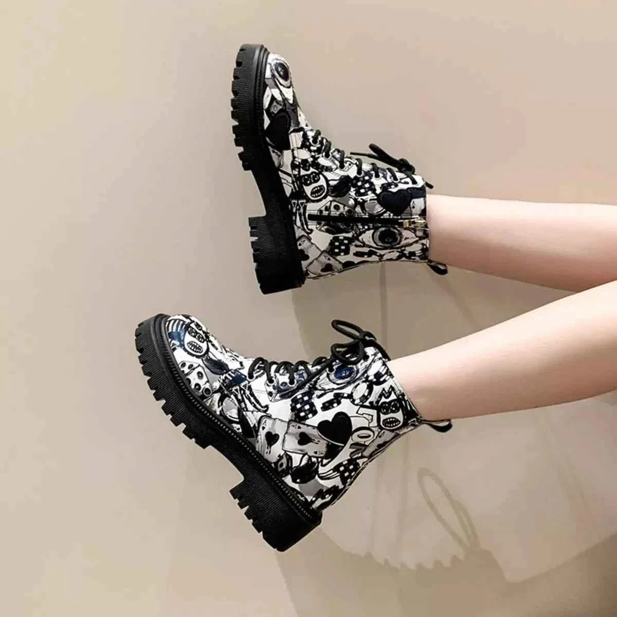 Pair these graffiti print combat boots with jeans and a leather jacket for a casual and cool look, or dress them up with a mini skirt and crop top for a more playful vibe. The bold design allows you to make a fashion statement wherever you go. Add a pop of color and personality to your wardrobe with these unique street art boots!