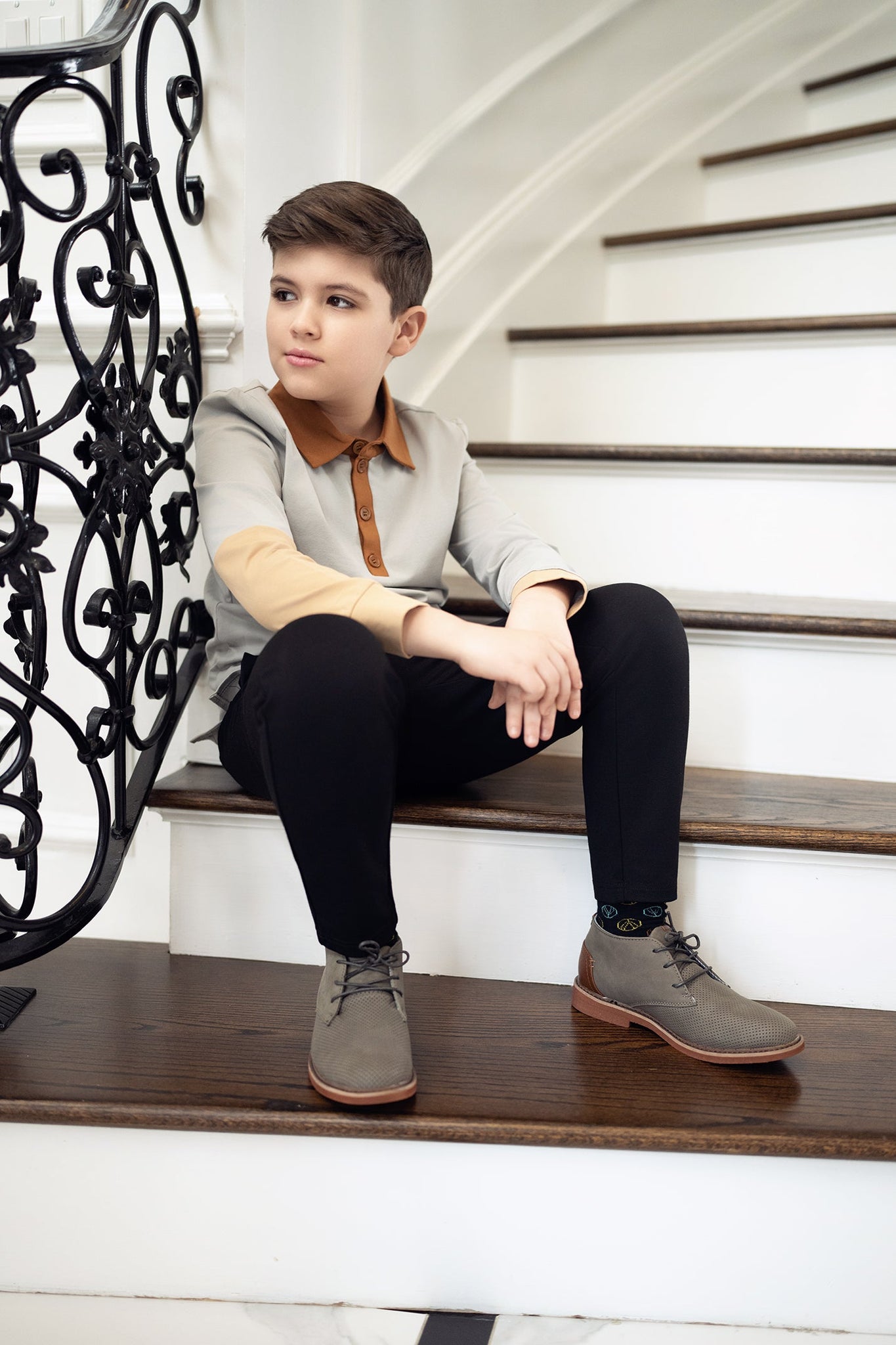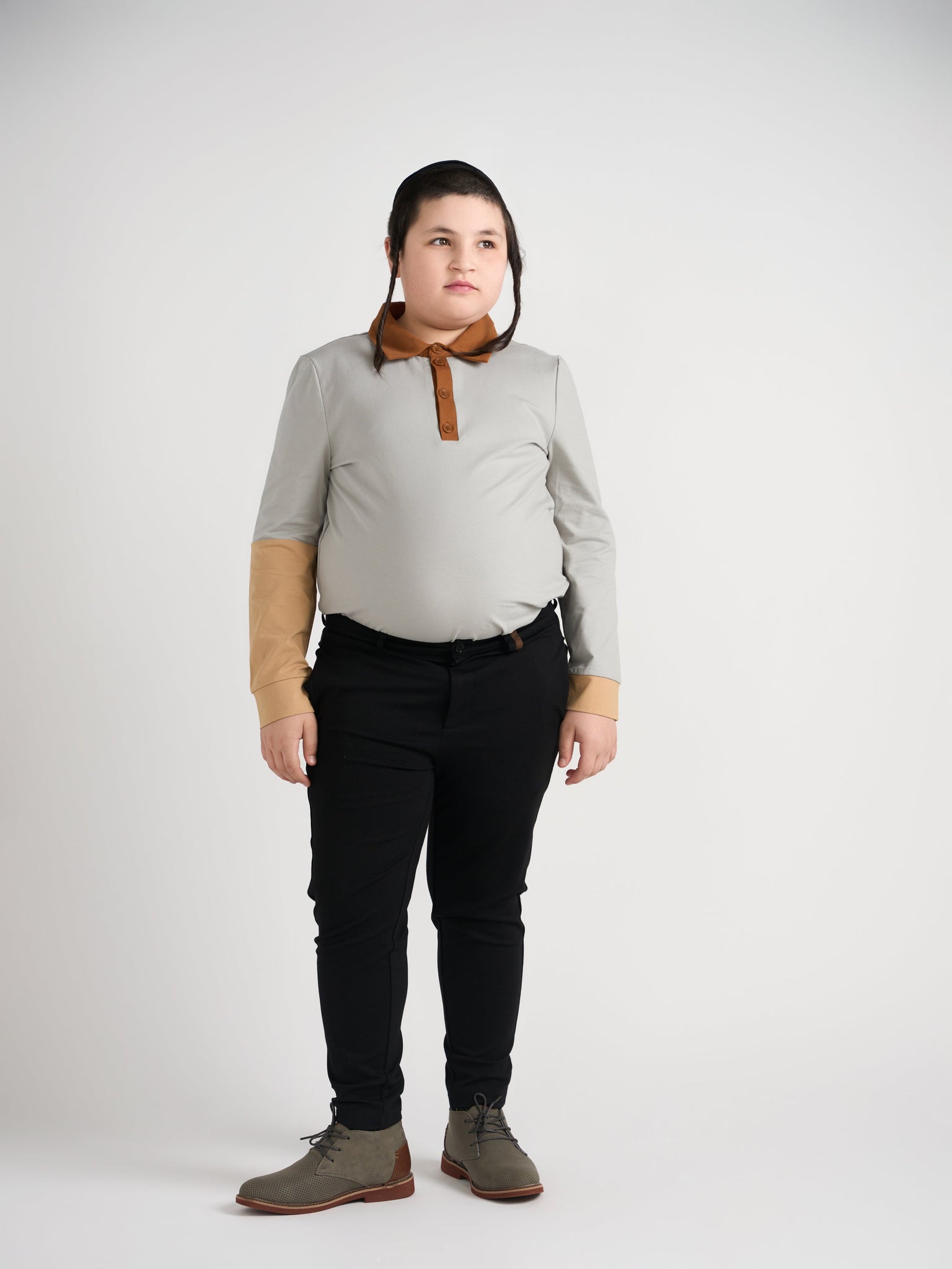 Our gray color block polo is made from a soft cotton/spandex blend for a comfortable fit with a little stretch. With a spread collar, 4 buttons and a color block cuffed sleeve makes rolling up the sleeves a breeze.