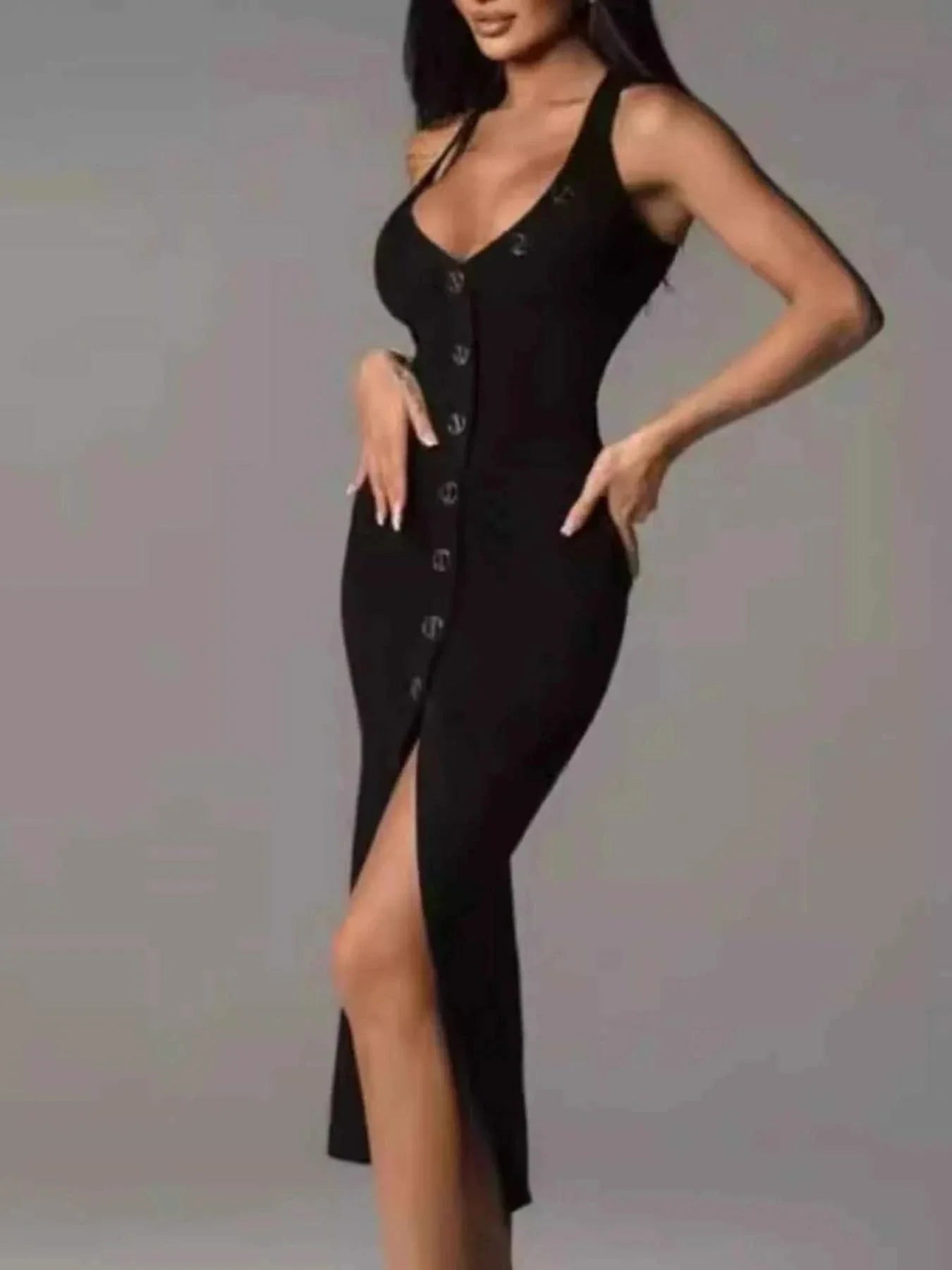 This bodycon dress features a trendy halter neck design that adds a touch of sophistication to your outfit. The sleek halter straps loop around the back of the neck, creating a flattering silhouette that highlights your shoulders and neckline. With a button-front detail down the front, this dress is perfect for a night out on the town or a special occasion.