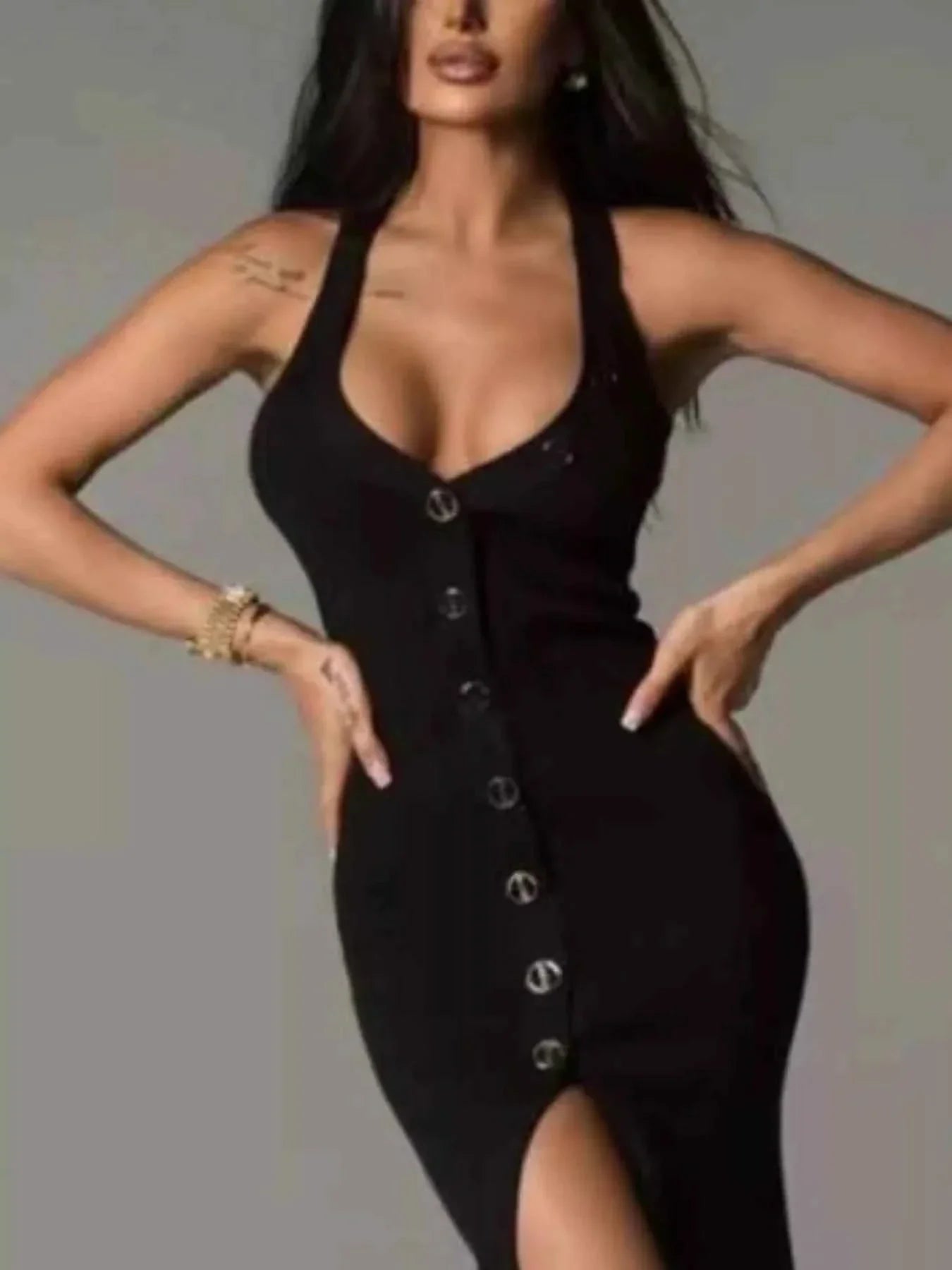 This halter neck bodycon dress is a versatile piece that can be dressed up or down for any occasion. Wear it with sandals and a floppy hat for a casual day out, or dress it up with strappy heels and a clutch for a night on the town. The classic black color makes it easy to accessorize and style in a variety of ways. Add this dress to your wardrobe for a go-to option that will never go out of style.