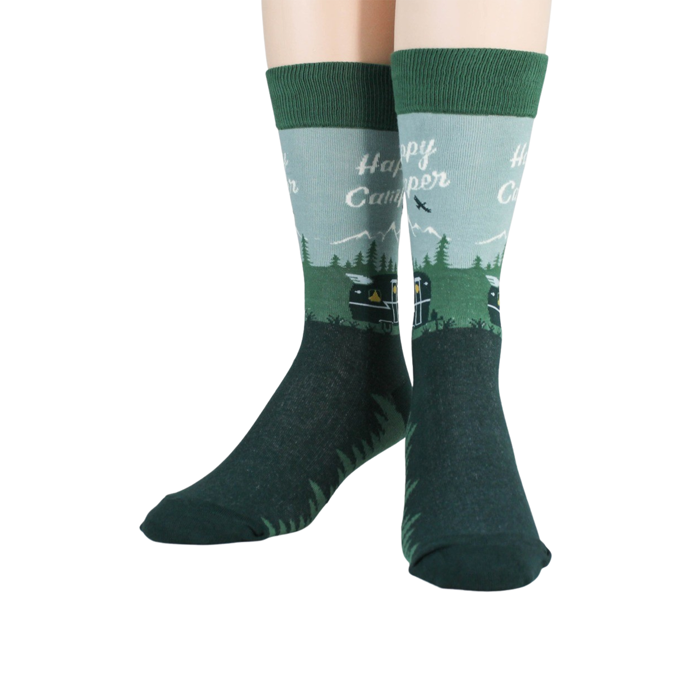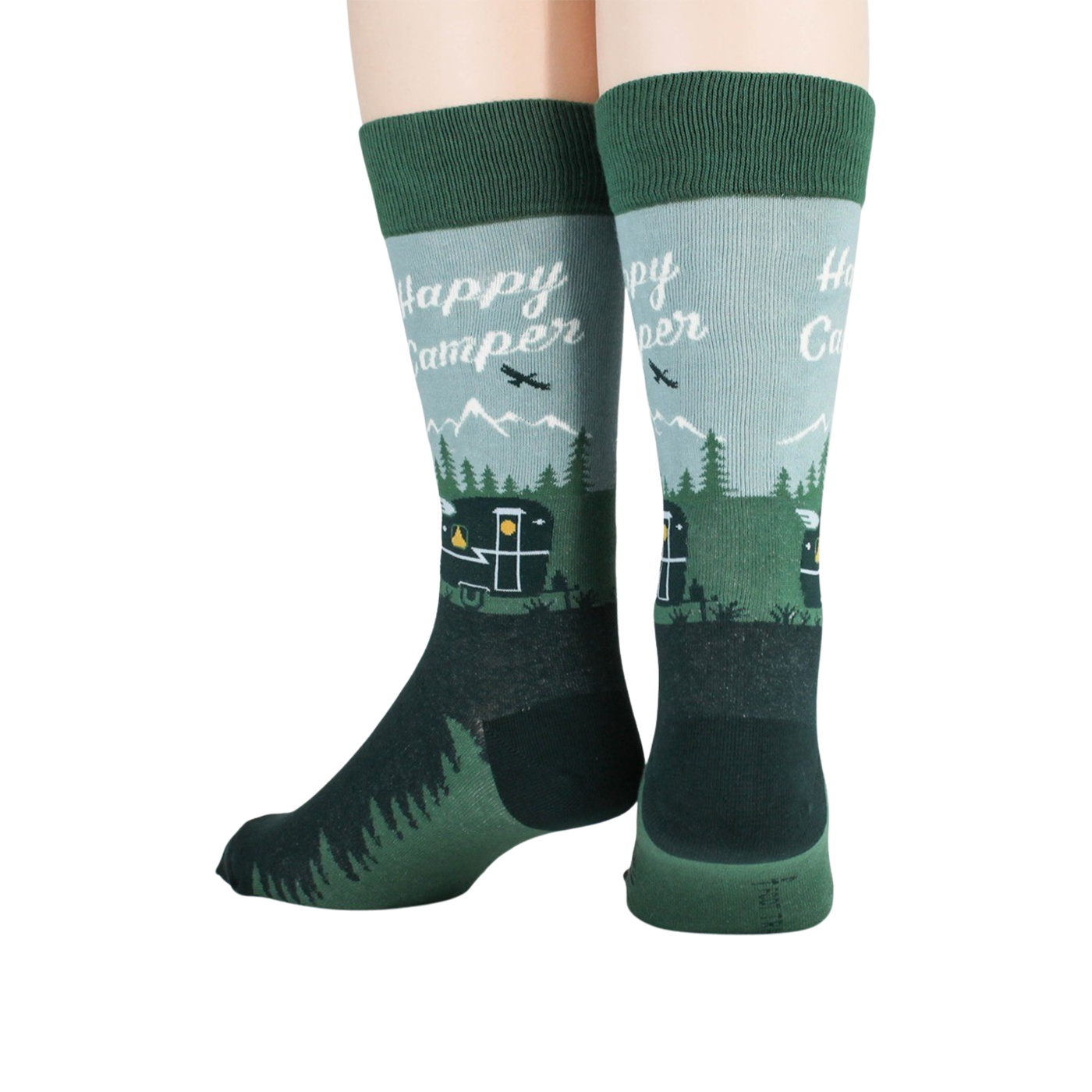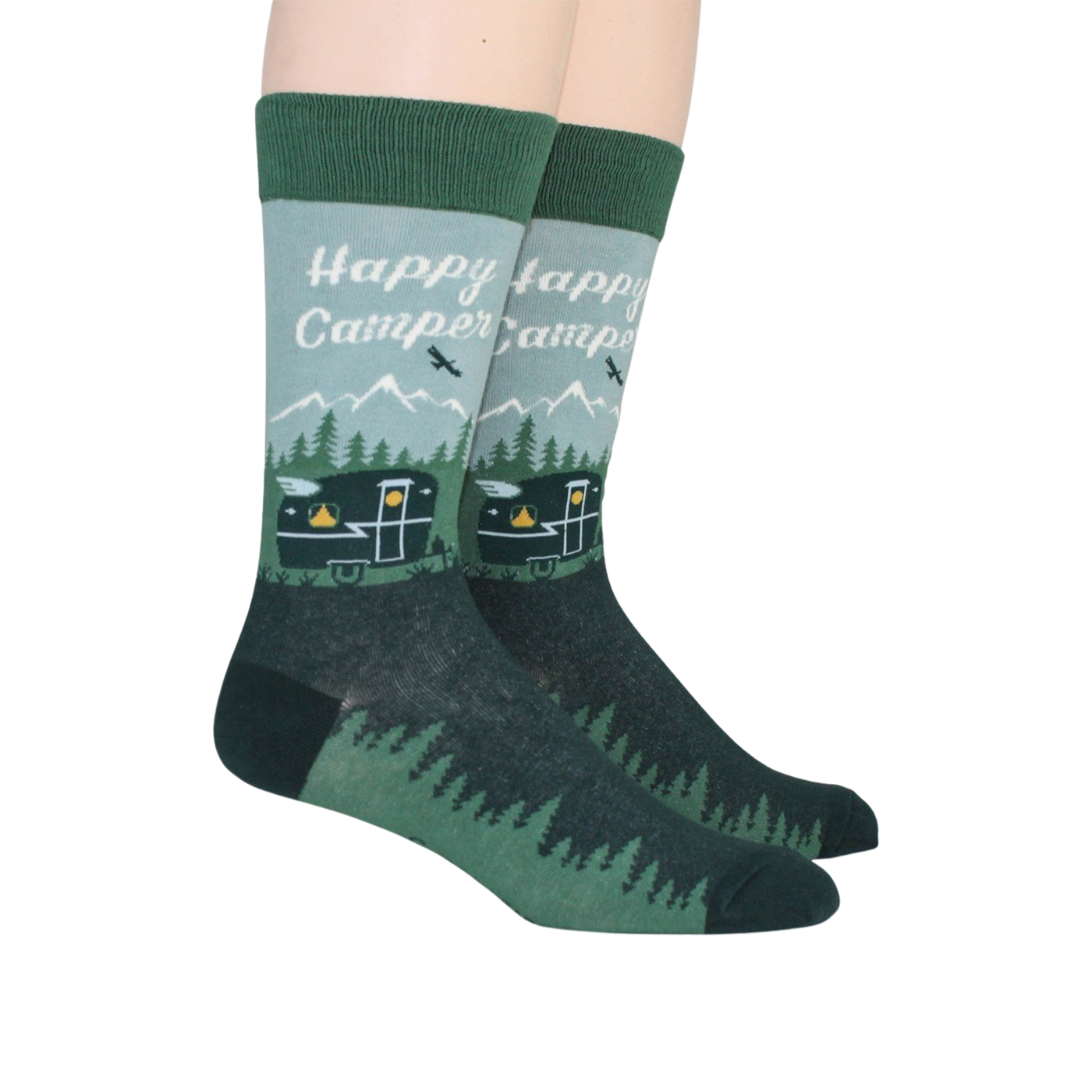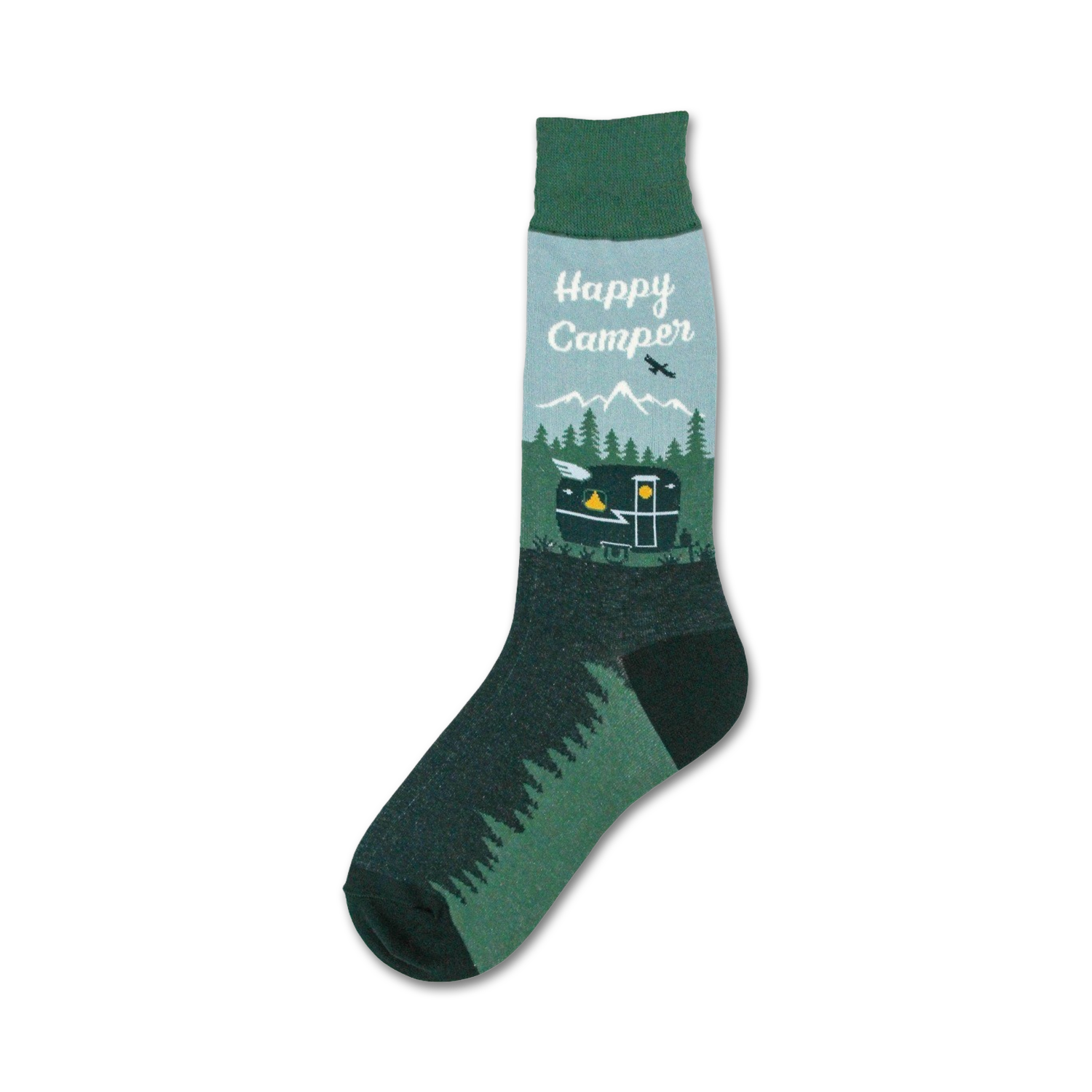 You can't keep a good camper down, even when they're just lounging at home in these Happy Camper socks. With their lush forest green background, white mountain peaks, and pop of yellow, these socks are sure to put a smile on your face, and they're the perfect accessory for your next outdoor adventure.