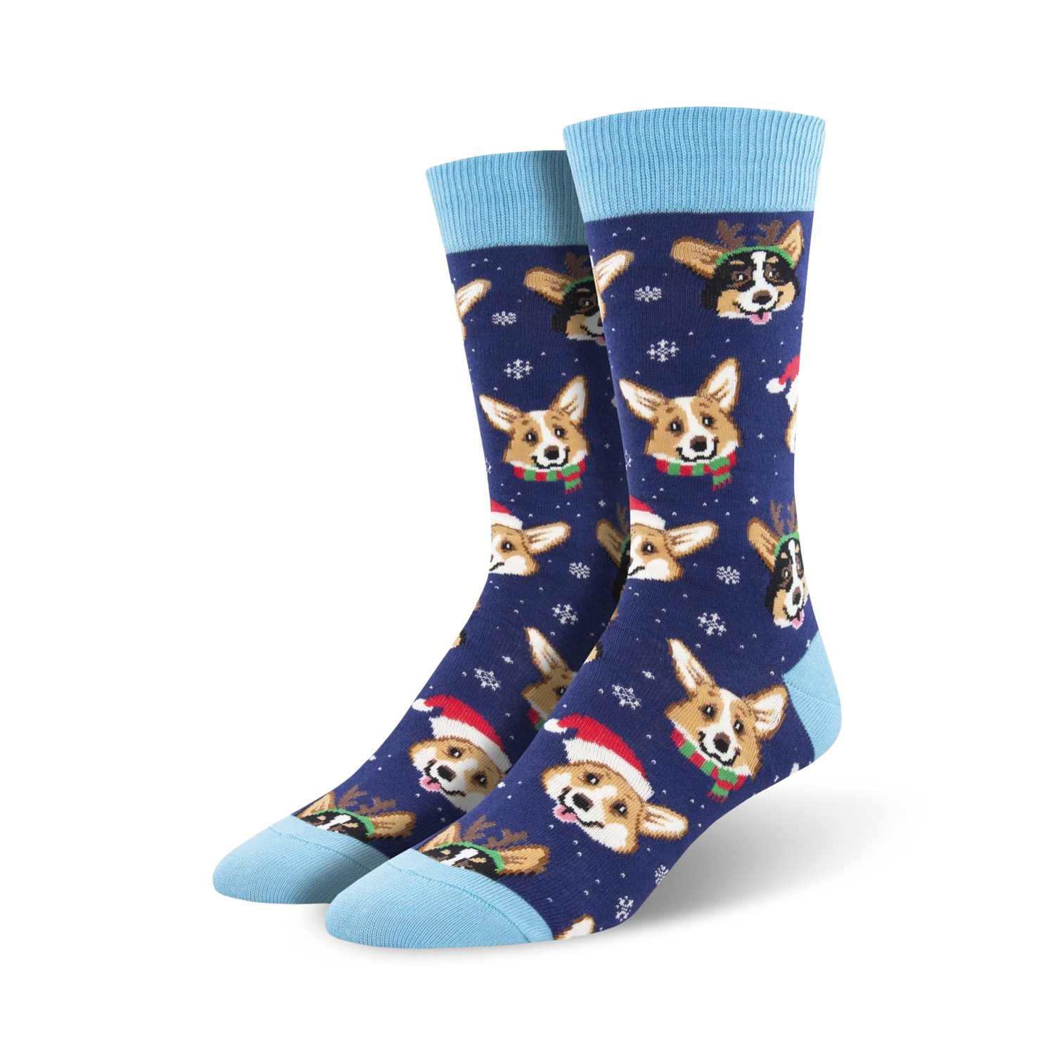 These Happy Pawlidays crew socks for men are a festive way to celebrate the season! Featuring a cheerful pattern of cartoon corgis wearing Santa hats and reindeer antlers, these socks are sure to bring a smile to your face. Show your holiday spirit and keep your feet cozy with these fun and festive socks.