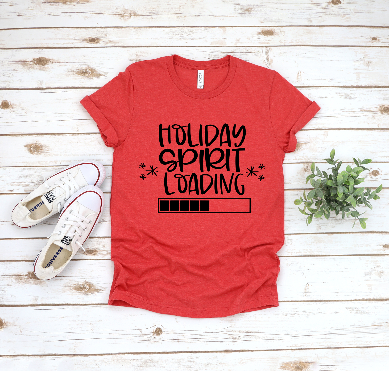 This soft and comfy Bella Canvas brand tee features the phrase "Holiday Spirit Loading" in black.