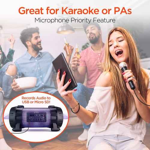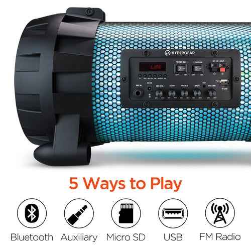 The HyperSonic portable speaker is in a league of its own pairing massive sound with unmistakable looks and an eye-catching multi-colored light show. It sets the bar as one of the loudest speakers in its class. Crafted for true music enthusiasts, it delivers robust well-balanced sound with a deep bass, clear midrange, and extended highs. The analog knobs allow you to fine-tune the controls to your personal preferences while the guitar-influenced strap enables easy and stylish travel. Now charge it up, light it up, crank it up and start Living Loud!