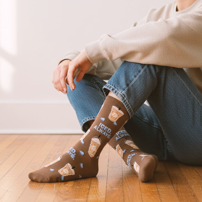 Chill out and show off your cool style with our 'Iced Always' novelty socks! Adorned with quirky iced coffees complete with whipped cream and blue ice cubes, these socks are a sip of fun for any outfit. Perfect for cafe hangouts or lazy Sunday brunches, they're bound to stir up conversations and smiles. Why settle for plain when you can express your love for iced coffee right down to your toes? Grab a pair today and let your feet do the talking at your next social gathering!