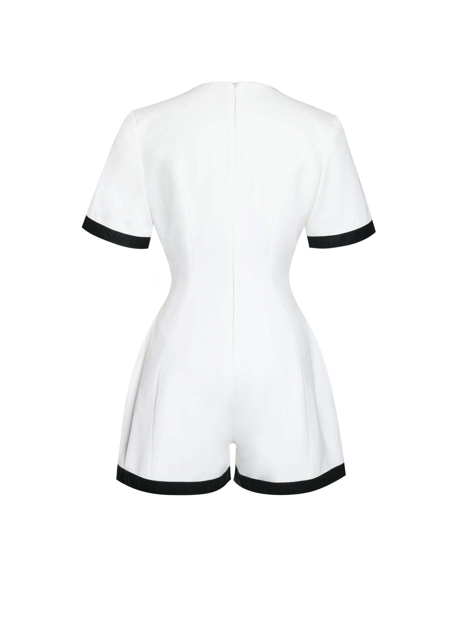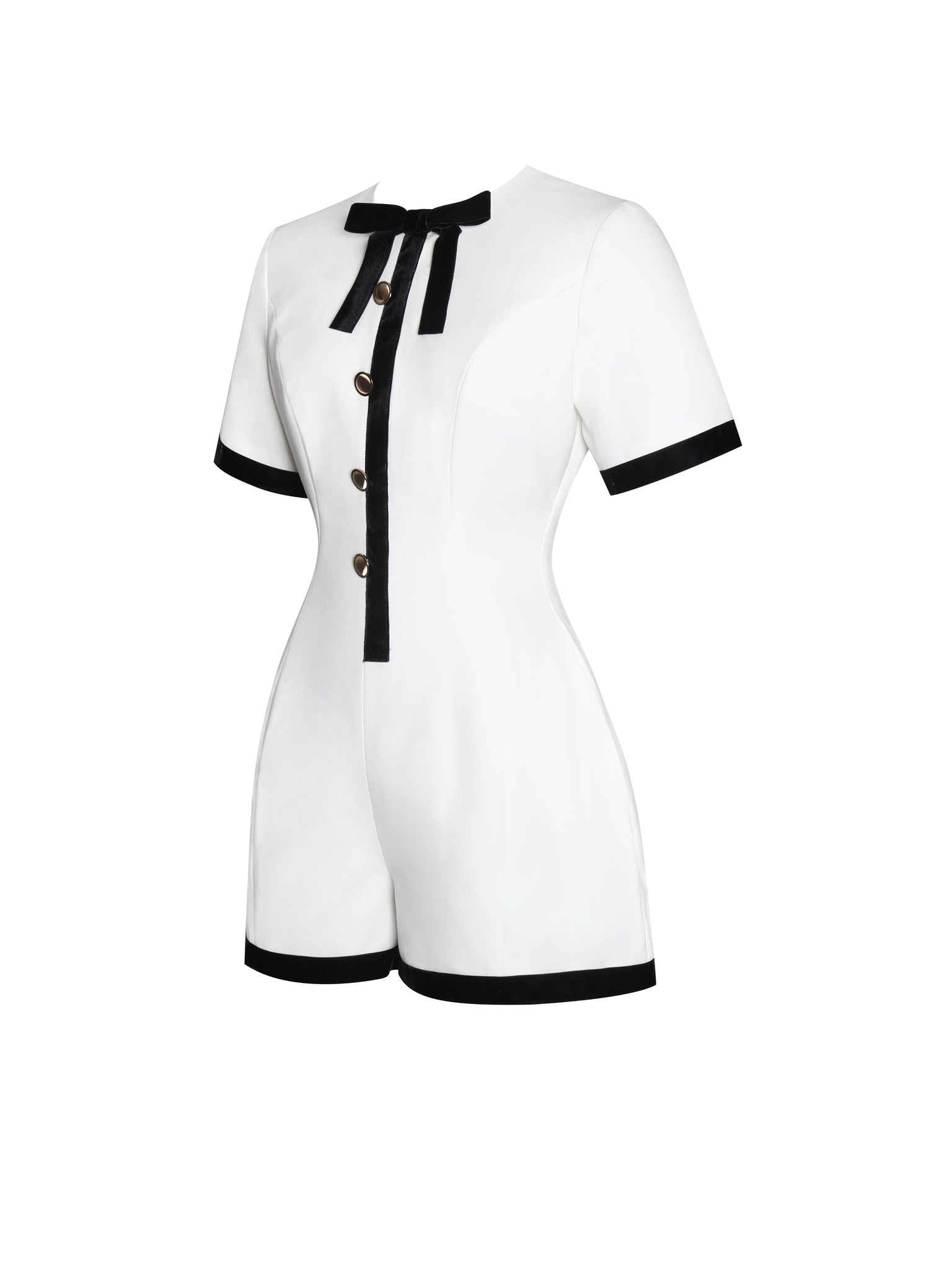 The Idina Romper is a sophisticated blend of business casual elegance and modern charm, perfect for spring picnics, daily wear, or formal events. Crafted from white crepe with black velvet trim, this chic piece features a timeless crew neck and short sleeves accented by gold buttons for a touch of luxury. The wide leg design creates a flattering silhouette, while invisible pockets add functionality. An invisible zipper ensures a seamless fit, making the Idina Romper a versatile staple for any occasion.