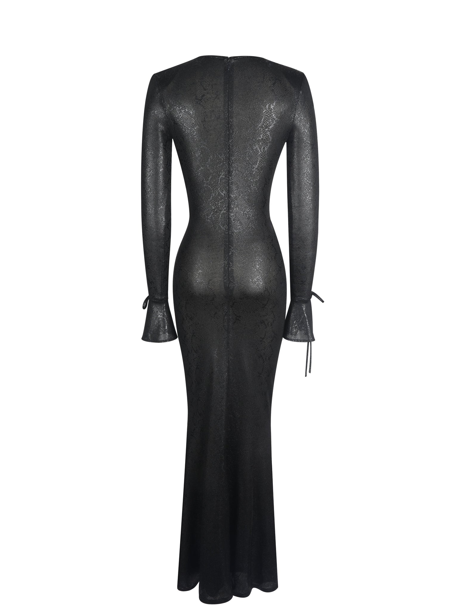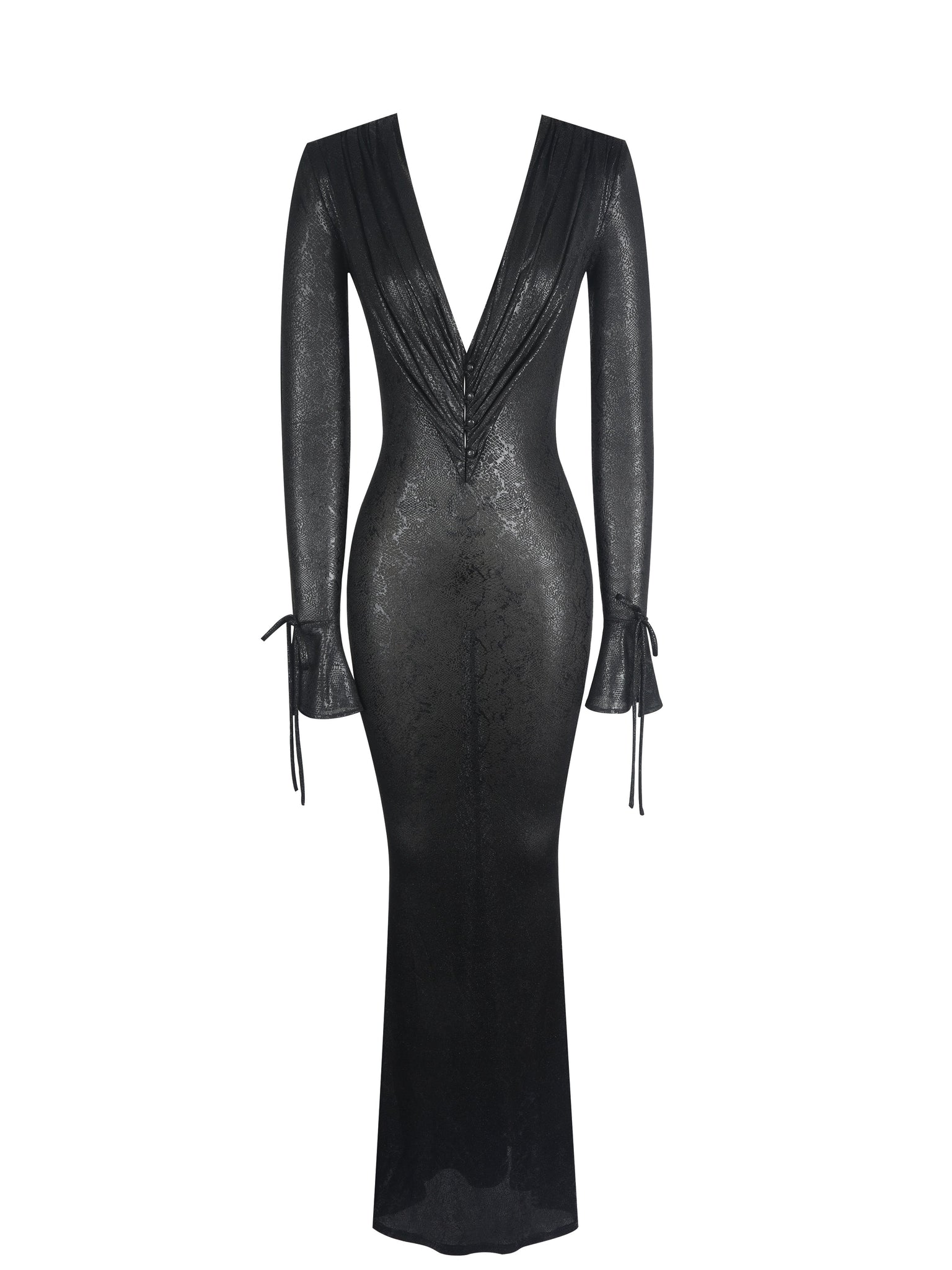 Own the night in the Ilysia Dress, made in a black snakeskin-print jersey that turns every step into a statement. With a plunging V-neckline framed by delicate ruching and velvet shank buttons, this maxi silhouette brings major main-character energy. The subtly sheer mesh base reveals a glossy, dimensional snakeskin pattern that brings a touch of intrigue and after-dark sophistication. Flared sleeves finished with dainty ties add a hint of drama, while the mermaid hem flares just enough to make every exit unforgettable. Finished with an invisible back zipper for a seamless fit, this dress is perfect for cocktail hours, late-night soirées, or any moment you intend to own the room.