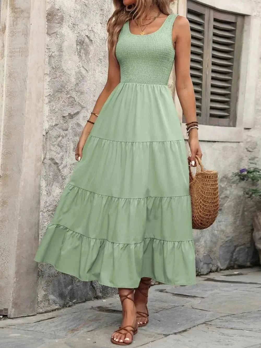 This tank dress is crafted from a soft and breathable fabric that keeps you cool and comfortable in warm weather. The sleeveless design and relaxed fit make it easy to move around in, while the smocked detailing at the neckline adds a flattering touch. Pair it with your favorite sandals for a laid-back look, or dress it up with heels and accessories for a more polished ensemble.