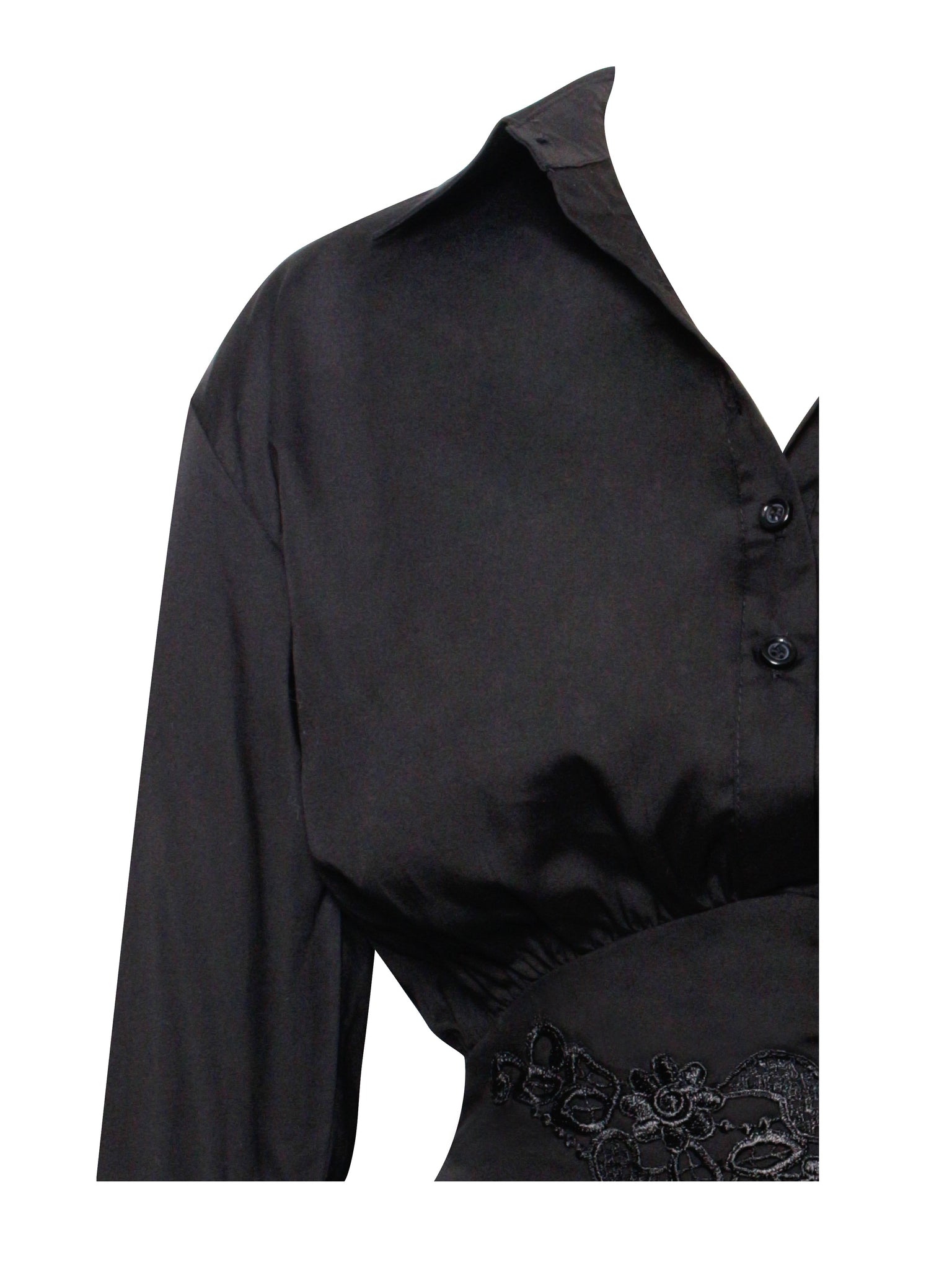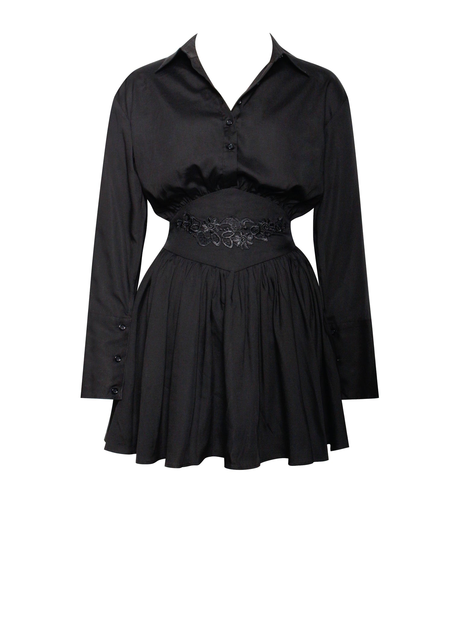 Introducing the Jamila dress, a stylish eco-luxe long-sleeve mini shirt dress designed for both comfort and elegance. The loose-fitting top features a sophisticated long cuff with three buttons, adding a refined touch. The corset waist, adorned with delicate lace decoration, creates a flattering silhouette and adds a hint of romance. An invisible side zipper ensures a seamless fit, enhancing the dress's sleek look. Perfect for any occasion, this dress combines casual charm with chic details, making it a versatile addition to your wardrobe. And it is also available in White.