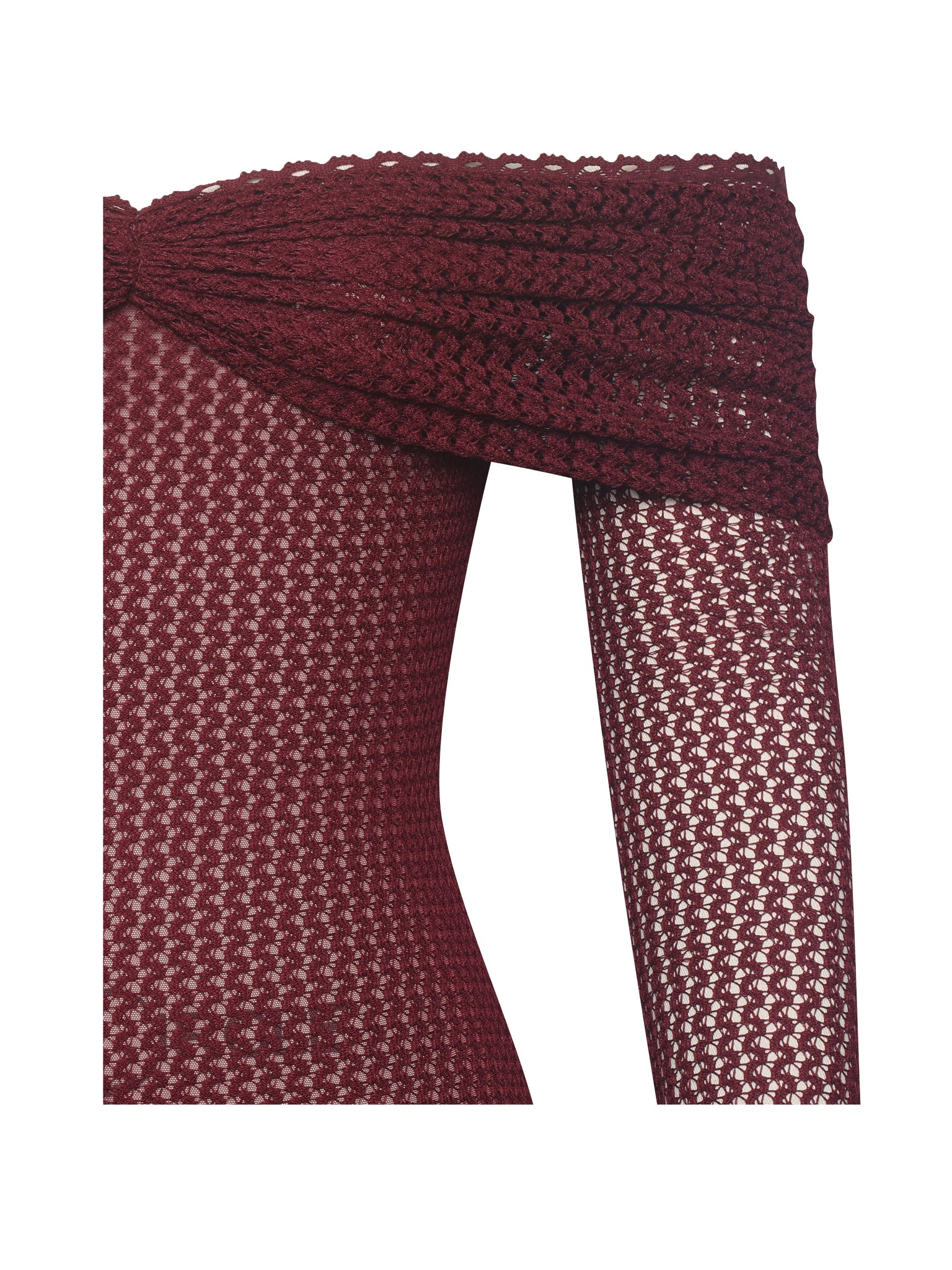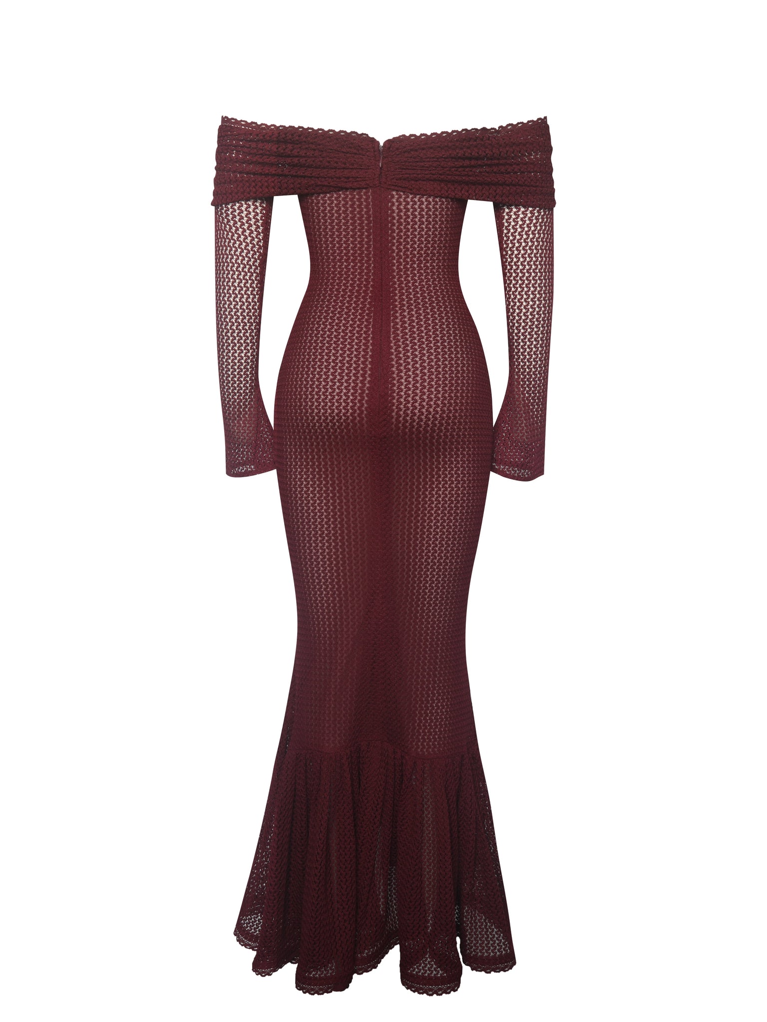 The Kaedyn Dress is your answer to timeless elegance with a sultry twist. Crafted from rich burgundy crochet lace, this off-the-shoulder maxi stuns with ruched detailing that gracefully wraps your curves, flaring into a dramatic mermaid hem that moves with you. Delicate lace trim along the neckline and hem adds a romantic finish, while slightly flared sleeves bring a whisper of vintage charm. Fully lined in nude mesh for comfort and coverage, and finished with an invisible back zipper, this showstopper is perfect for candlelit weddings, formal soirées, or any occasion where you plan to leave an unforgettable impression.