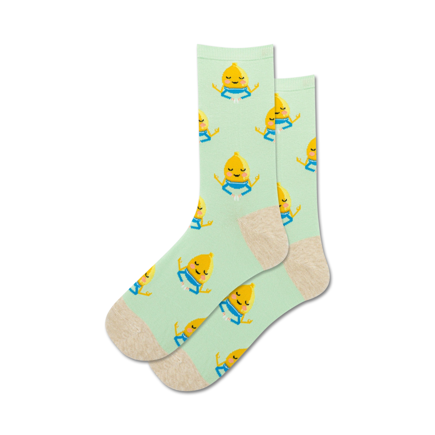 Pucker up and prepare to be puckled with glee because these socks are lemon zest-y! Picture a garden party in your feet, where gray socks play host to a group of meditating lemons, their yellow bodies and blue eyes exuding inner peace. Join the lemon circle and let the day's stresses melt away like sorbet on a hot summer day. Be warned: these socks may inspire you to start a lemon-aid stand, teach yoga, or write haiku about citrus. Get ready to add a twist of fun to your sock drawer and pucker up for some serious style.