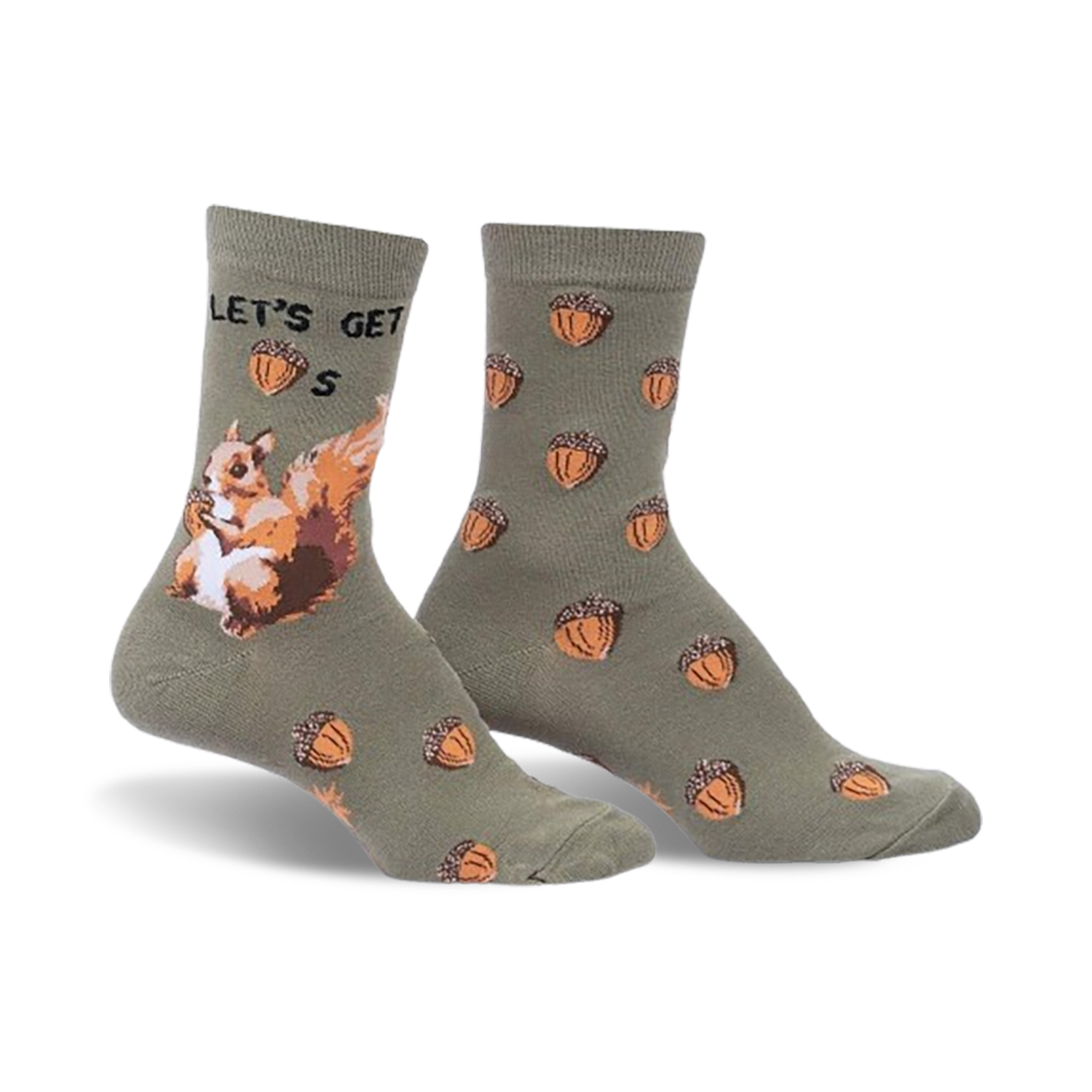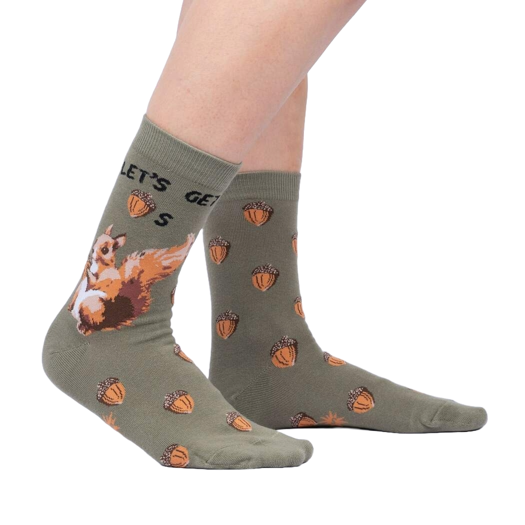 In this world of nuts, acorns are getting all the attention! Jump on the tree and crack open a few laughs in these "Let's Get Nuts" novelty socks featuring an adorable squirrel stashing acorns away for the winter on one foot, and an all-over acorn pattern on the other, all on a crisp olive green background. These women's crew socks will add a touch of nature's humor to your day.