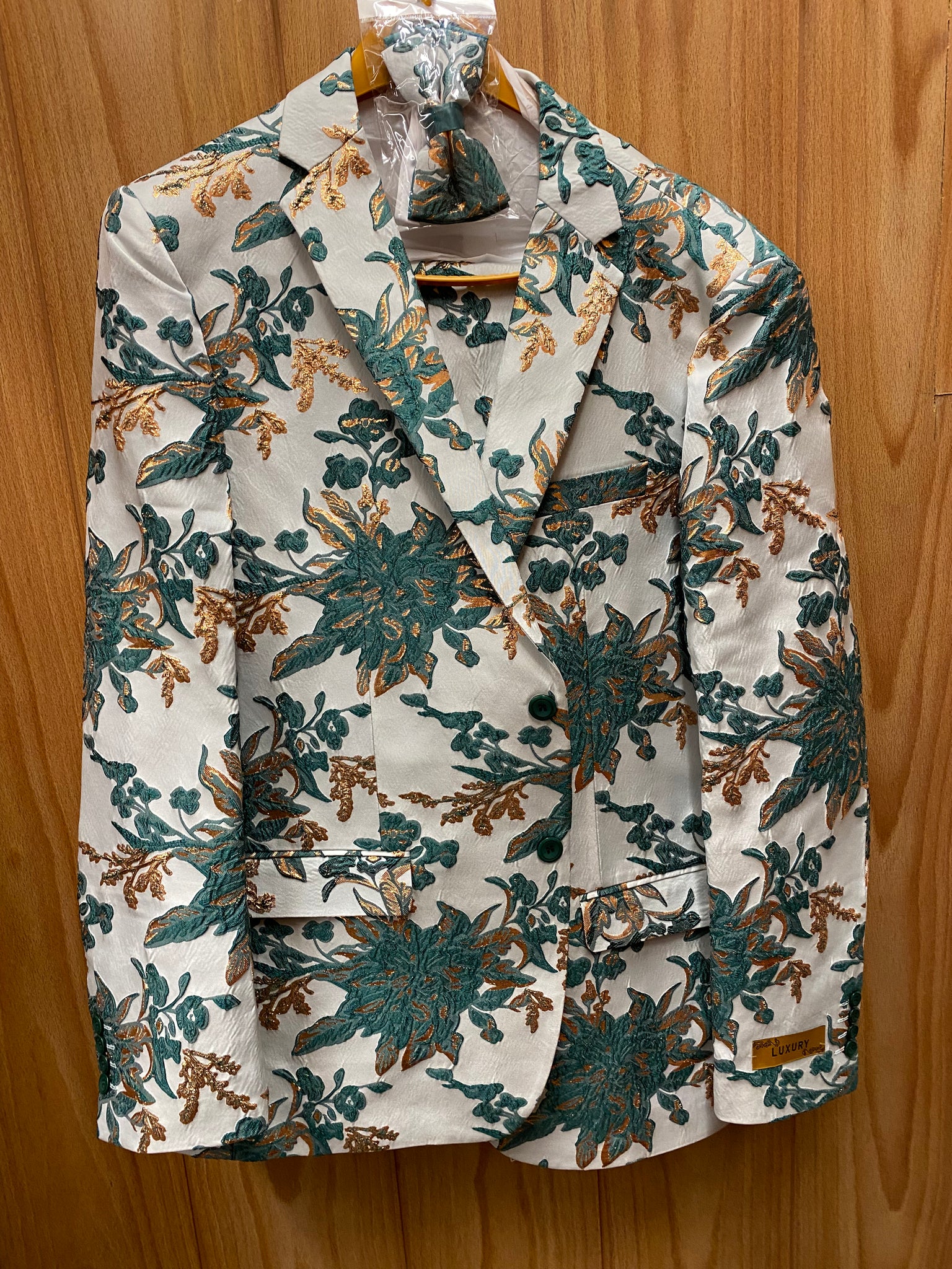 - Silvery white jacket with Hunter green and gold floral print