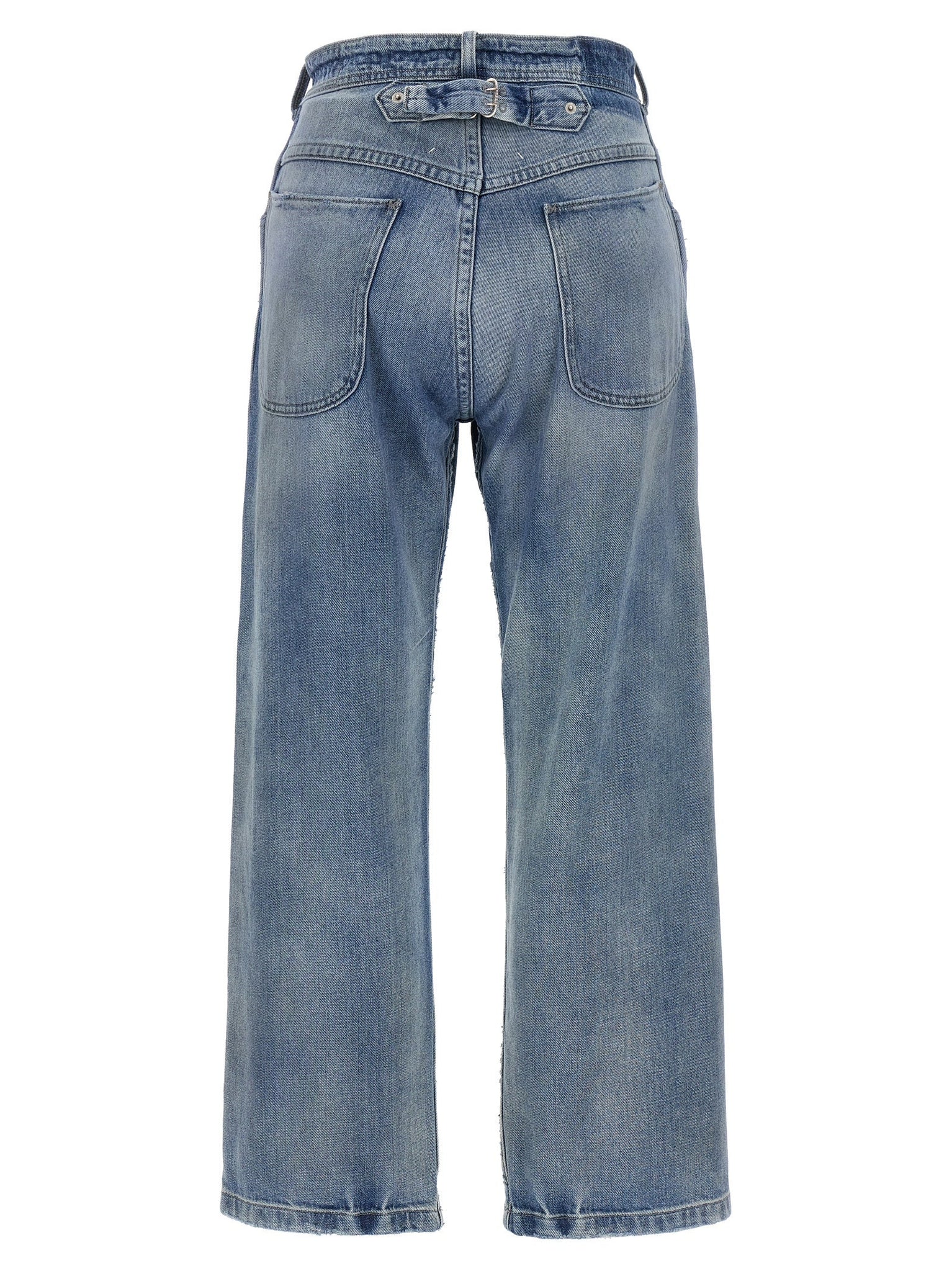 Used-effect cotton denim jeans, back metal buckle strap, five pockets, button closure, straight leg.