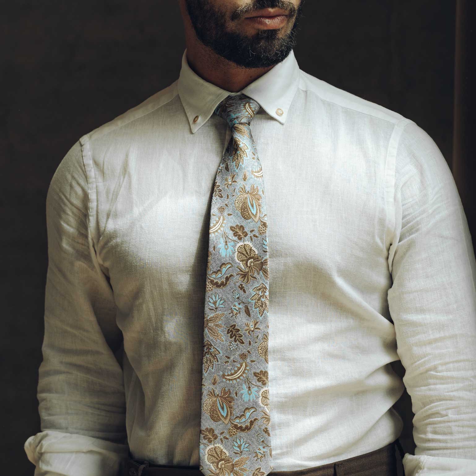 I named this tie after the Medici family, a symbol of power and refinement in Italian history. This beautiful dusty blue and steel tie features a delicate floral print in soft earthy tans.