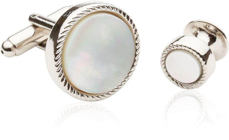 If a simple pair of cufflinks won't do the job and you need something to tie the whole outfit together. Our Ribbed Mother of Pearl Silver Tuxedo Cufflinks & Stud sets answer the call! This luxurious set of mother of pearl centers wrapped in rib-textured silver-plated settings elevates any outfit to elite status. Gorgeous links, and four studs to tie everything together. Let us know if you need multiples of this item and we can offer you a bulk discount. They come in a handsome and hard-sided gift box. We also carry this mother of pearl cufflink and stud set in gold plating.
