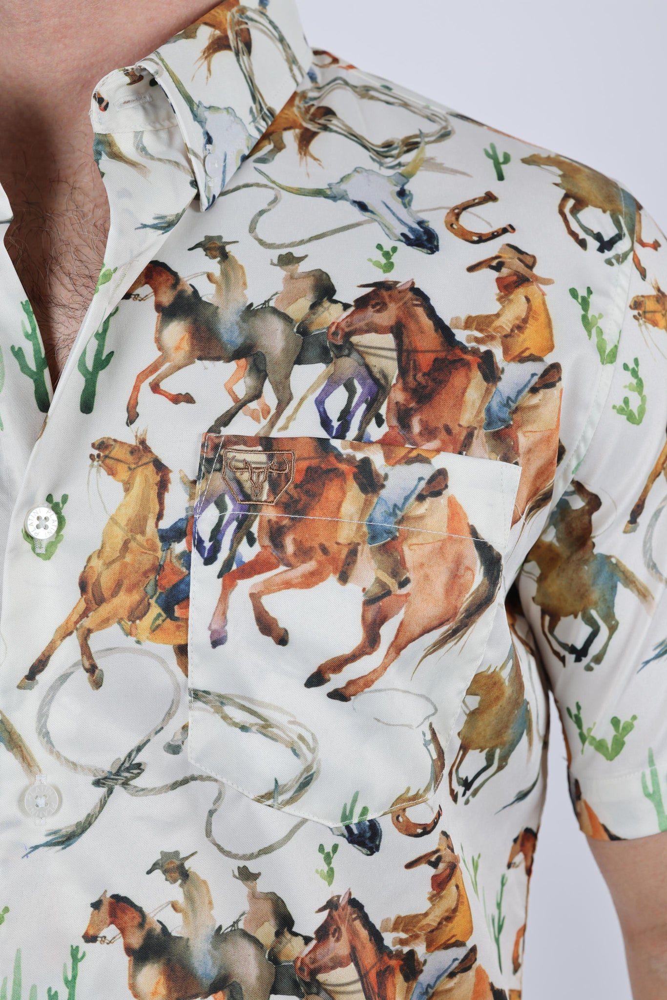 How to Wear: For a laid-back yet stylish outfit, pair this Wild Horses Print Shirt with your favorite jeans or chinos and casual sneakers. Layer it under a denim jacket for a rugged aesthetic, or wear it solo with shorts for a cool and comfortable summer look. Add a leather belt and sunglasses to complete your ensemble and embrace your adventurous spirit.