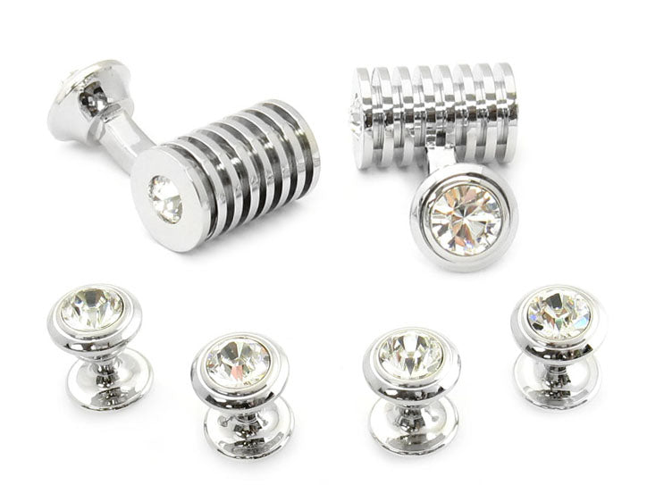 We do more than cuffs! Sometimes youve got a fancy shirt that also needs to be fastened down the front, and you cant go wrong adorning it with this set of Swarovski barrel style links and studs. The renowned Austrian maker of luxury cut crystal brings the bling! The links bear two clear crystal accents on either end, with a slightly larger one on the mount. The studs bear a single clear crystal enveloped by polished silver-toned mounts that augment their translucence. Add sturdy elegance to formal or business attire with this set. We also carry this set in Blue, Fuchsia, and Ruby Red; in addition to Silver-toned, this line-up is available in Rose Gold, and Gun Metal varieties. They come in a handsome and hard-sided gift box.