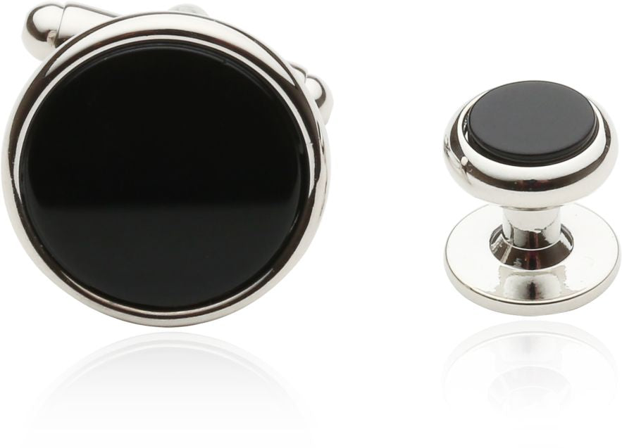 Sometimes you need more than bling at the end of your sleeves; you need it up and down as well. Our Tuxedo Cufflinks and Stud sets answer the call! Deep, dark glossy onyx adorns the center of all the pieces, which are wrapped in polished rhodium silver. The right amount of bling to tie together a formal outfit. We offer discounts and free shipping for multiple sets, so you can get your entire wedding party on the same fashion page. They come in a handsome and hard-sided gift box. We also carry this onyx cufflink and stud set in gold plating.