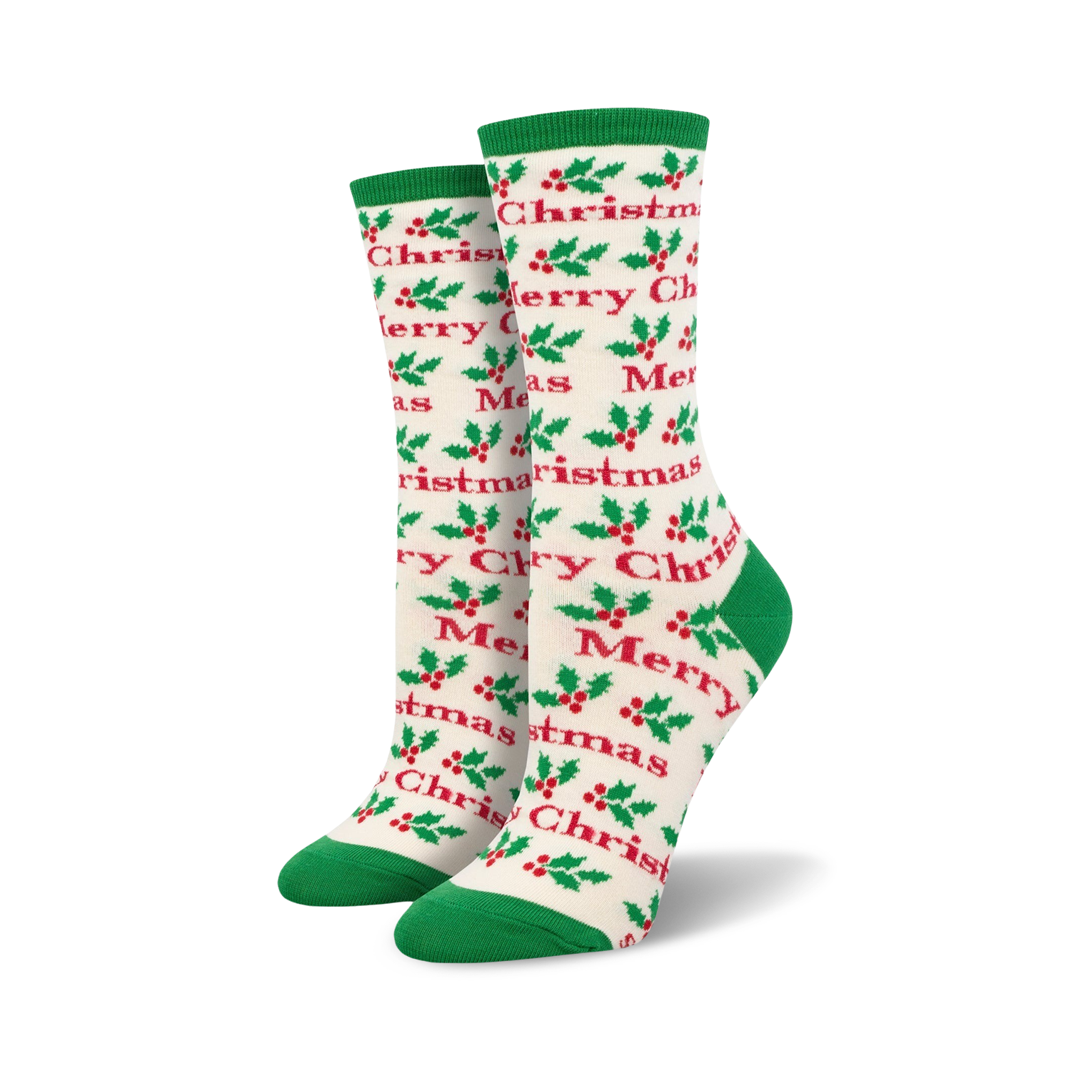 Jingle all the way in these festive Christmas socks! With a holly jolly red and green pattern and script lettering that spells out "Merry Christmas," these women's crew socks are the perfect way to spread holiday cheer wherever you go. Fun fact: A poinsettia's red and green hues are said to symbolize the blood of Christ and the evergreen of eternal life. Stay cozy and stylish this season with these merry and bright socks!