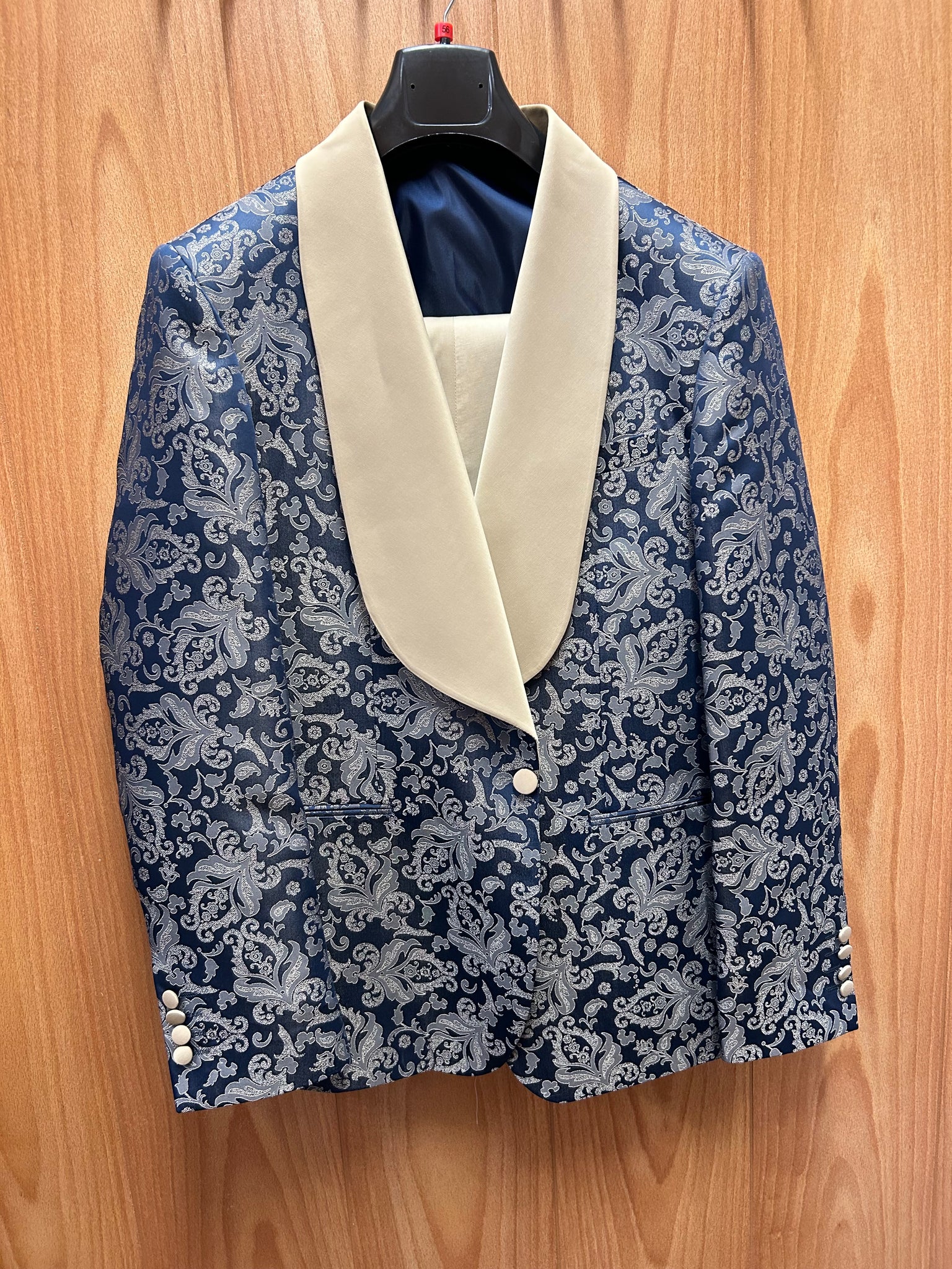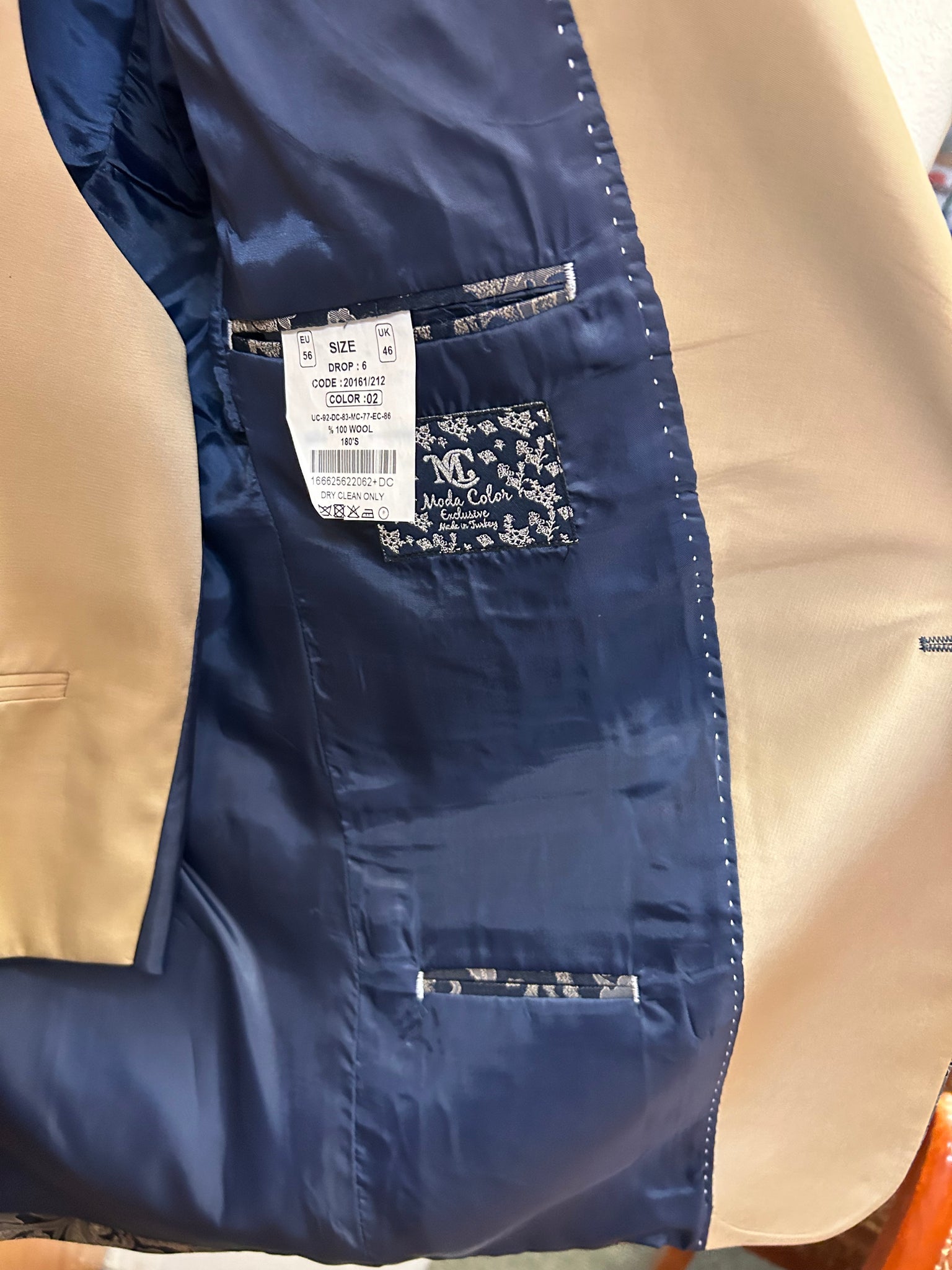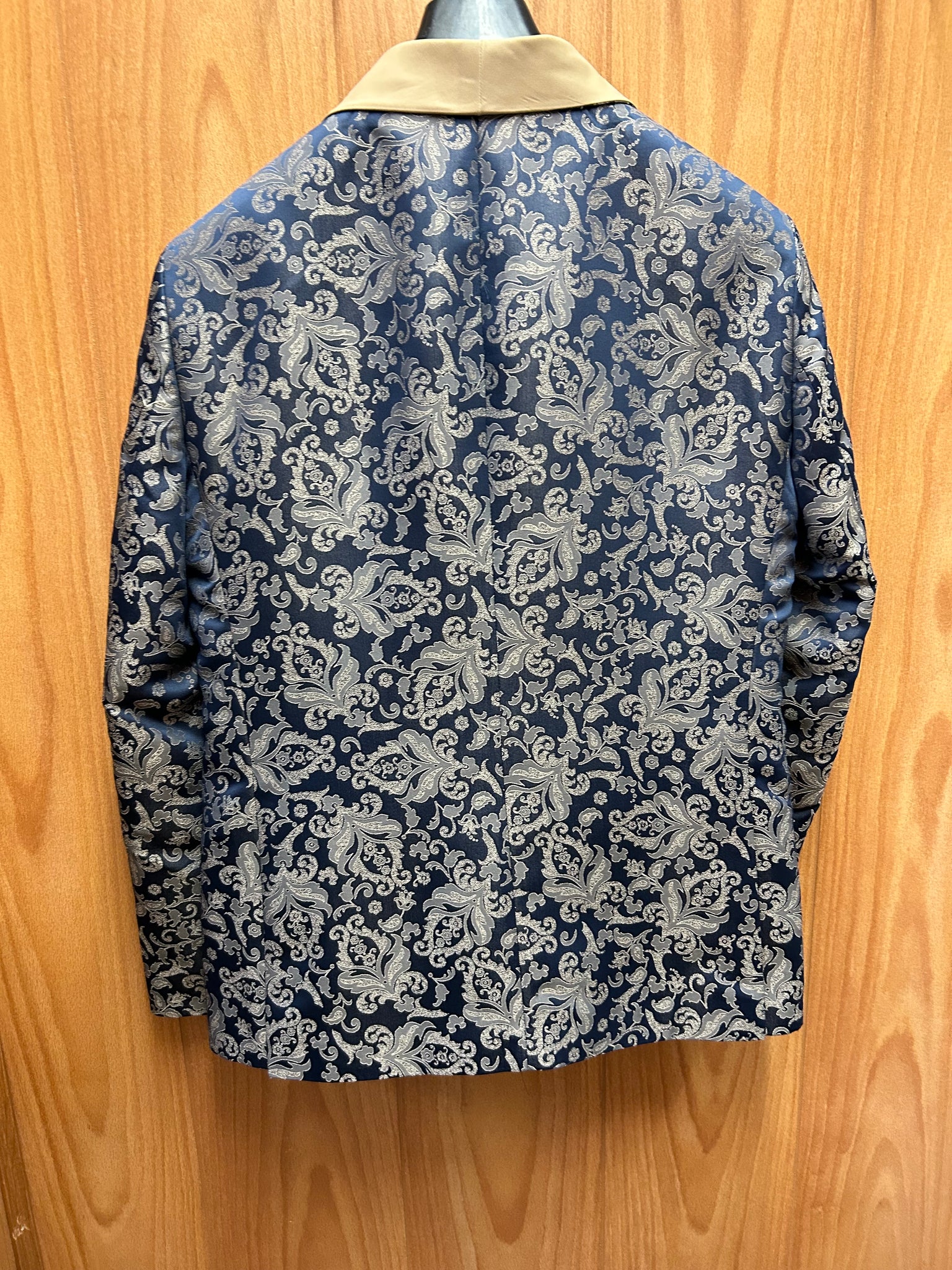 Look sharp and sophisticated with the Moda Color Exclusive Navy with Tan Paisley 3-Piece slim-fit Suit. Made from luxurious super 180's wool, this Turkish slim fit suit features a unique navy and tan paisley print jacket with a big shawl lapel and side vents. The solid tan vest and pre-hemmed pants complete the stylish look. Exclusively from the Moda Color collection.