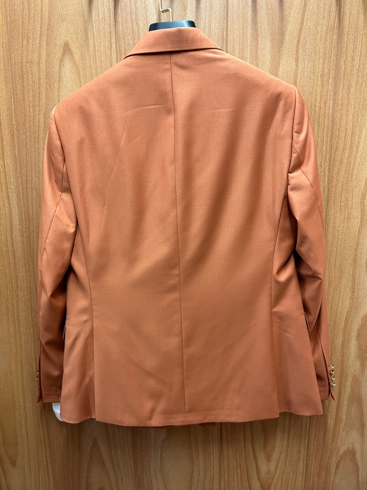 Elevate your look with the Moda Color Rust Gold Button Double Breasted Turkish Suit. This sophisticated suit features handcrafted gold buttons and a peak lapel for a touch of luxury. Made in Turkey, the slim fit and tapered pants offer a sleek silhouette that exudes elegance.