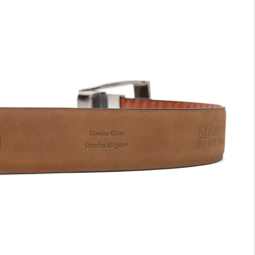 Finish your look with our genuine exotic combination alligator and cobra skin belts, featuring beautiful antiqued hand-finishes and soft interior lining. The brushed chrome buckle features subtle Marco Di Milano branding, and it easily removable in case you need your belt trimmed to size.