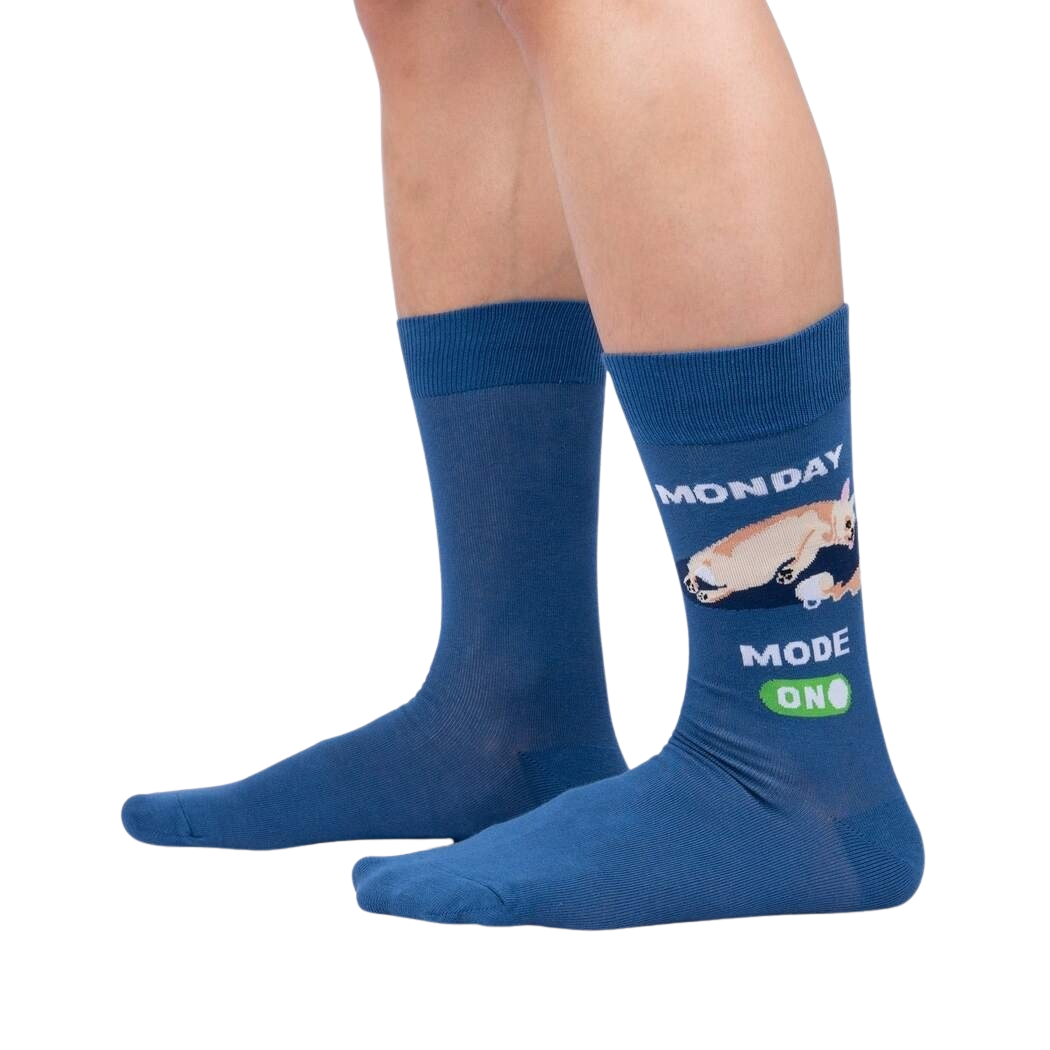 Monday Mode: On socks feature a sleeping cat with a green "ON" button, a friendly reminder that we all have a Monday Mode that needs to be turned on. These comfy, crew-length socks are perfect for those lazy mornings when all you want to do is curl up and snooze.