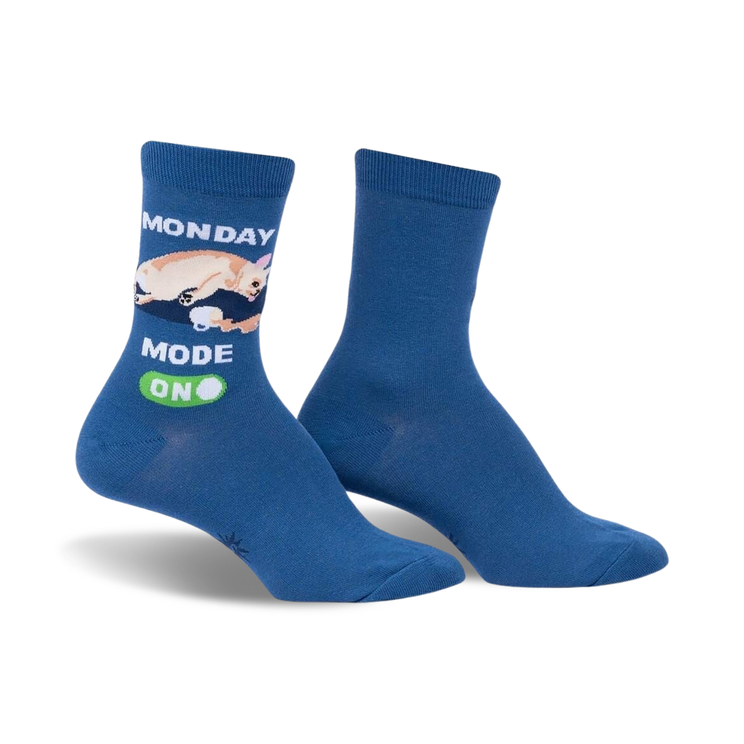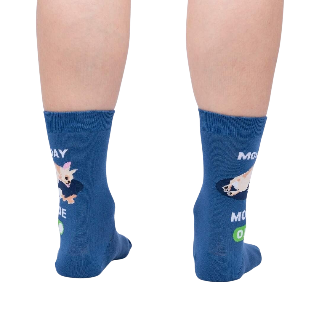 Get yourself some Monday Mode, On socks and see if you don't feel motivated even when it's the worst day of the week. Well, that's if you can stay awake long enough to get dressed! The socks are blue, and they feature a cute cat sleeping on a coffee cup. The words "Monday Mode, On" are printed in bold text above and below the picture. And if the kitty doesn't get you going, the caffeine will!