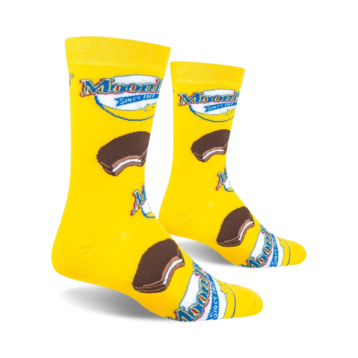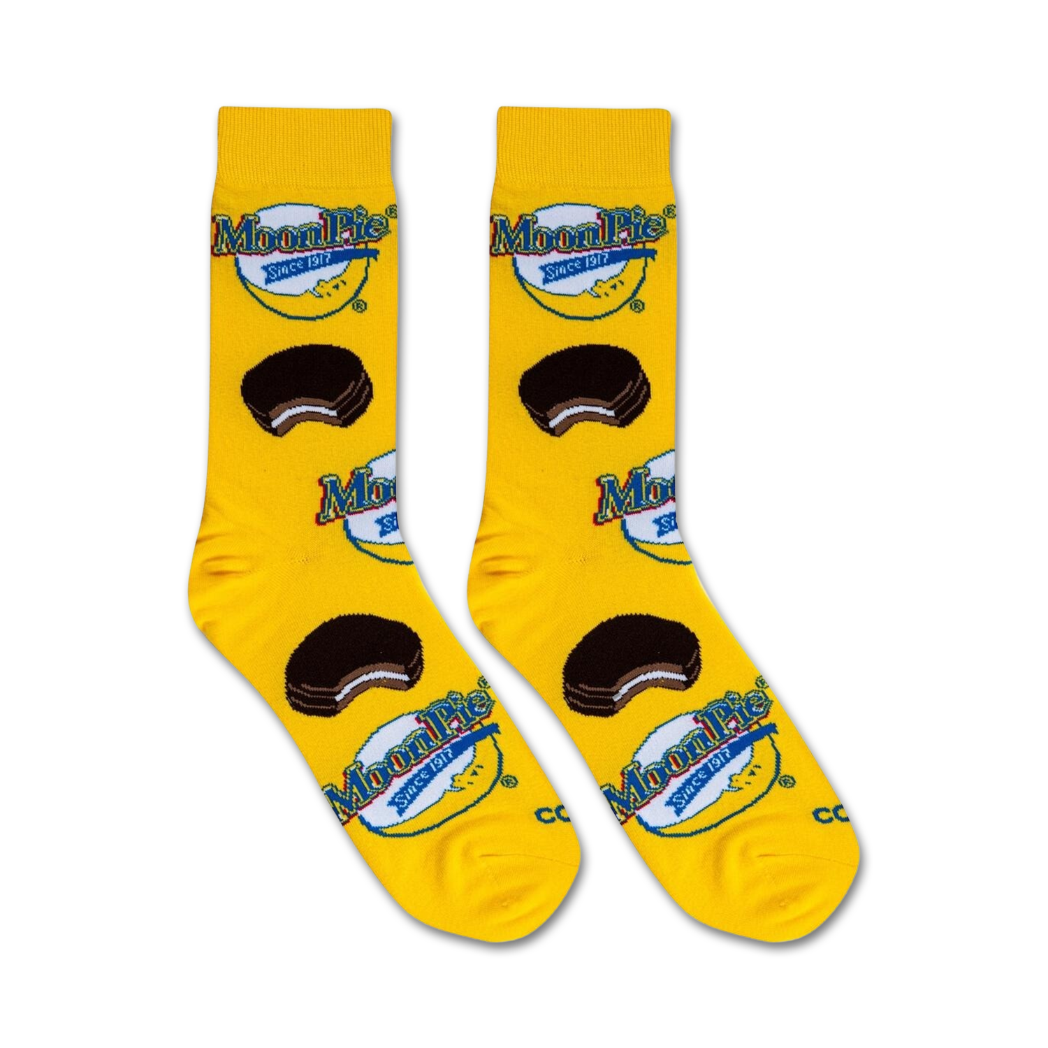 Dig into the cosmic goodness of our Moon Pie socks! With a vibrant pattern of chocolate-covered marshmallow treats, these crew socks are sure to satisfy your sweet tooth and tickle your funny bone. They're the perfect way to add a touch of whimsy to your everyday wardrobe. Prepare to hear "Those socks are the bomb!" every time you wear them ” they'll leave everyone craving more!