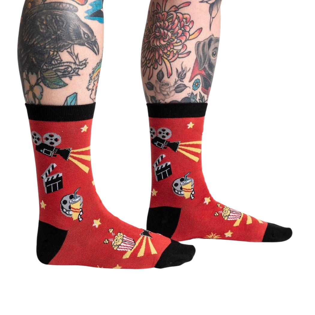 Get ready for a cinematic experience on your feet with our Movie Night Crew Socks! These red socks are bursting with popcorn, cola, stars, clapperboards, and projectors, making them the perfect accessory for any movie buff. Put on a pair and let the film festival begin! Fun fact: Popcorn was once considered a luxury food and was served at special occasions like weddings!