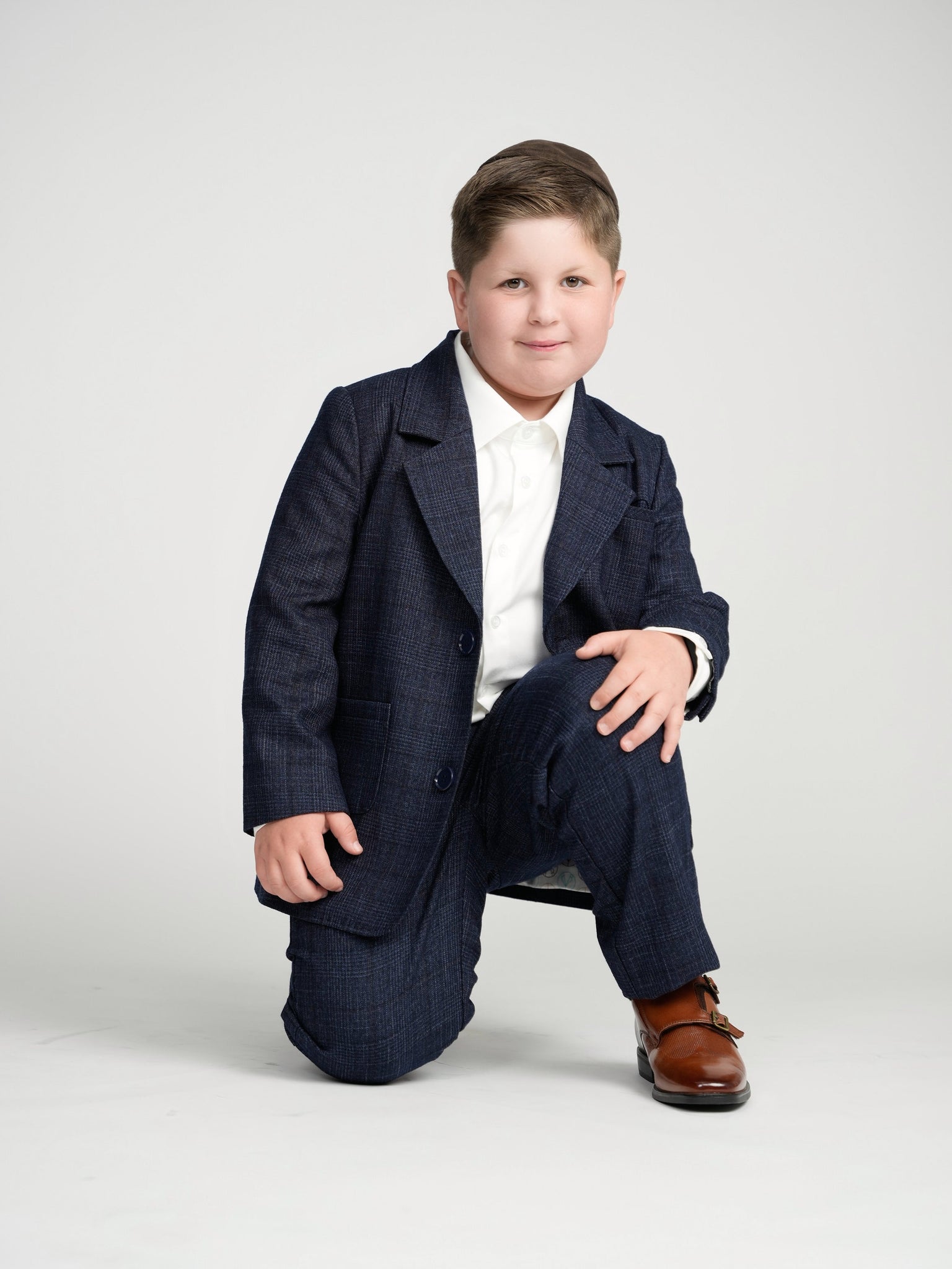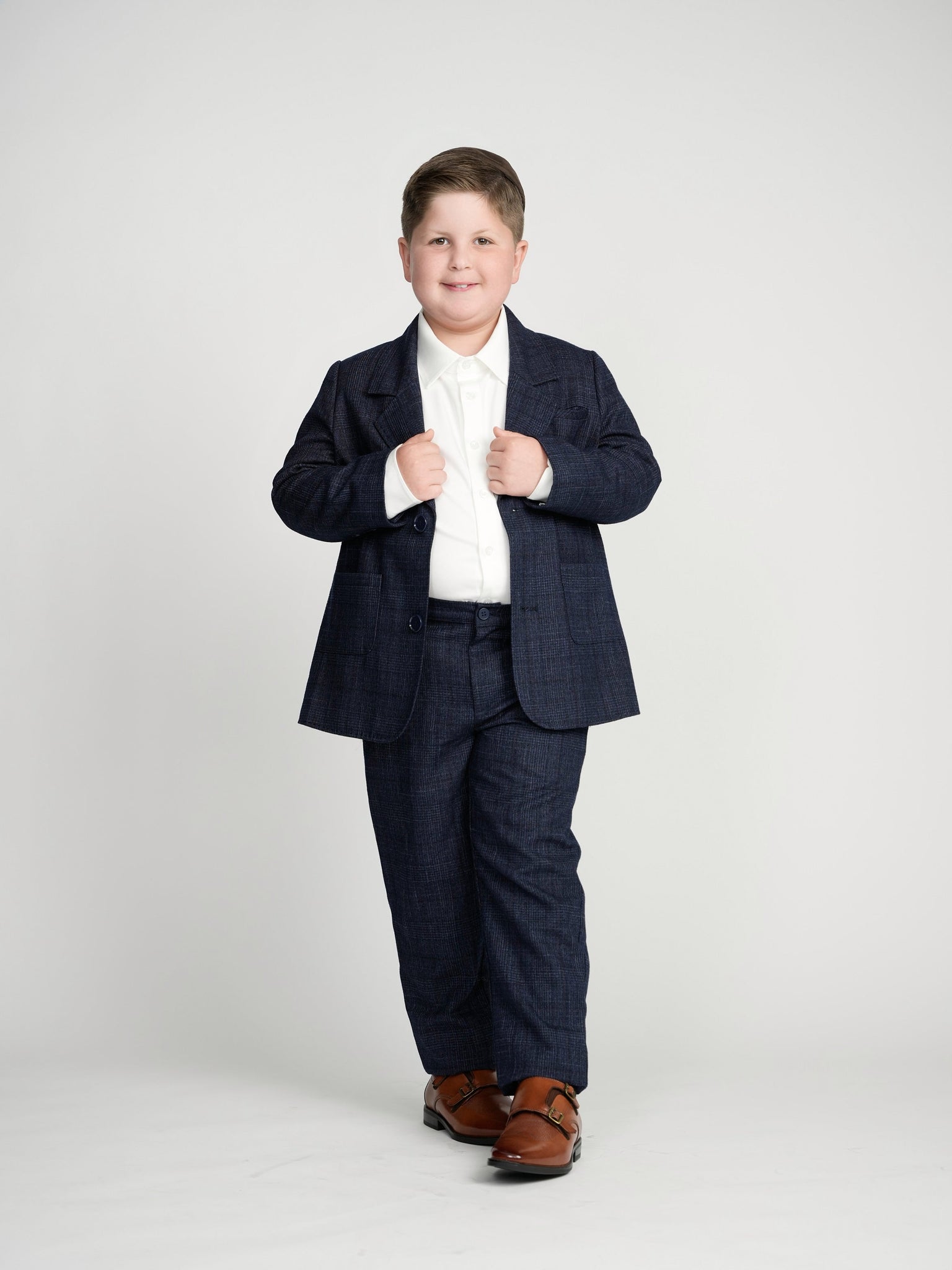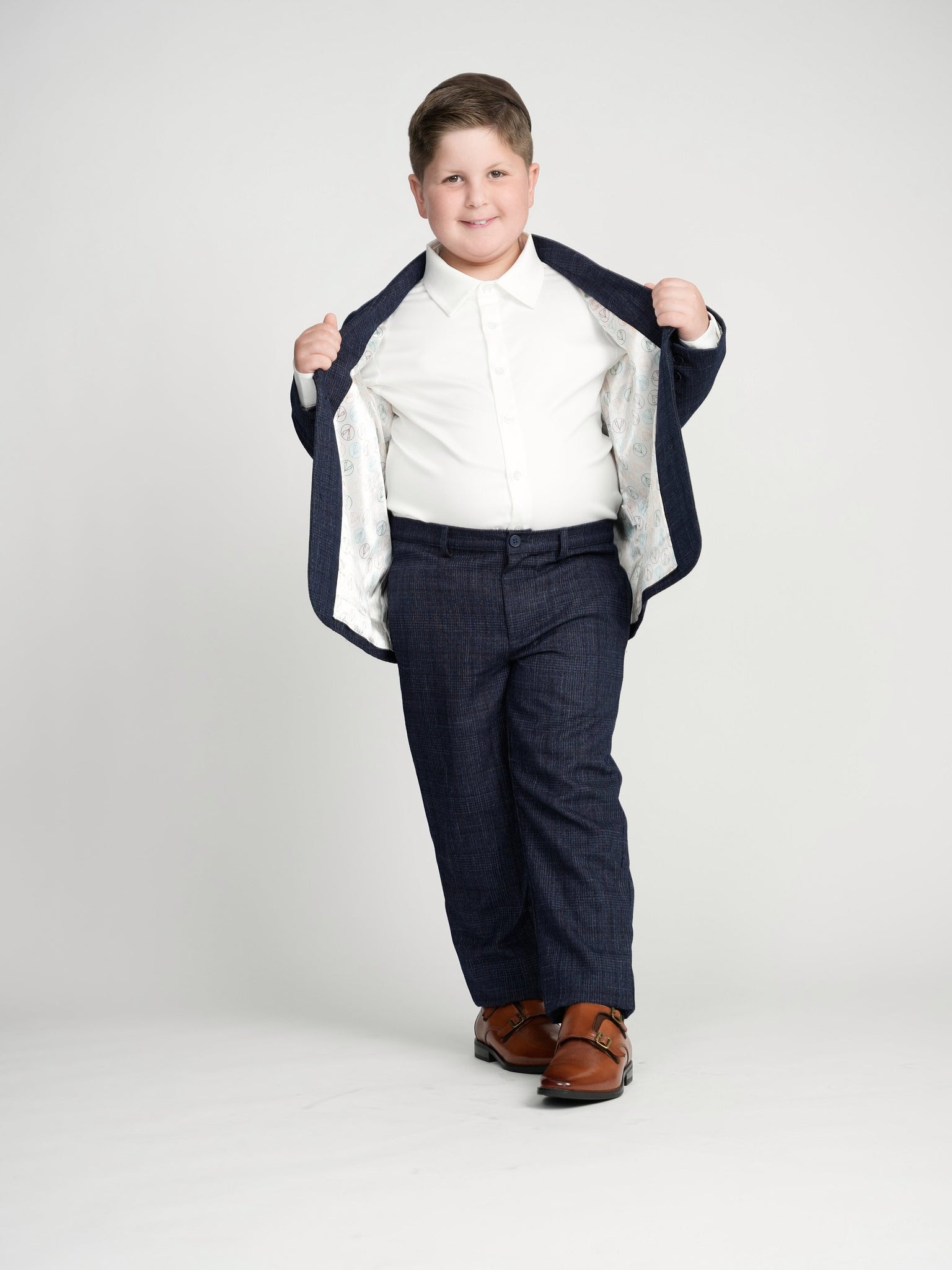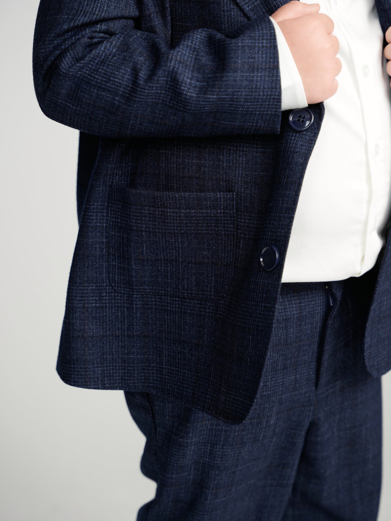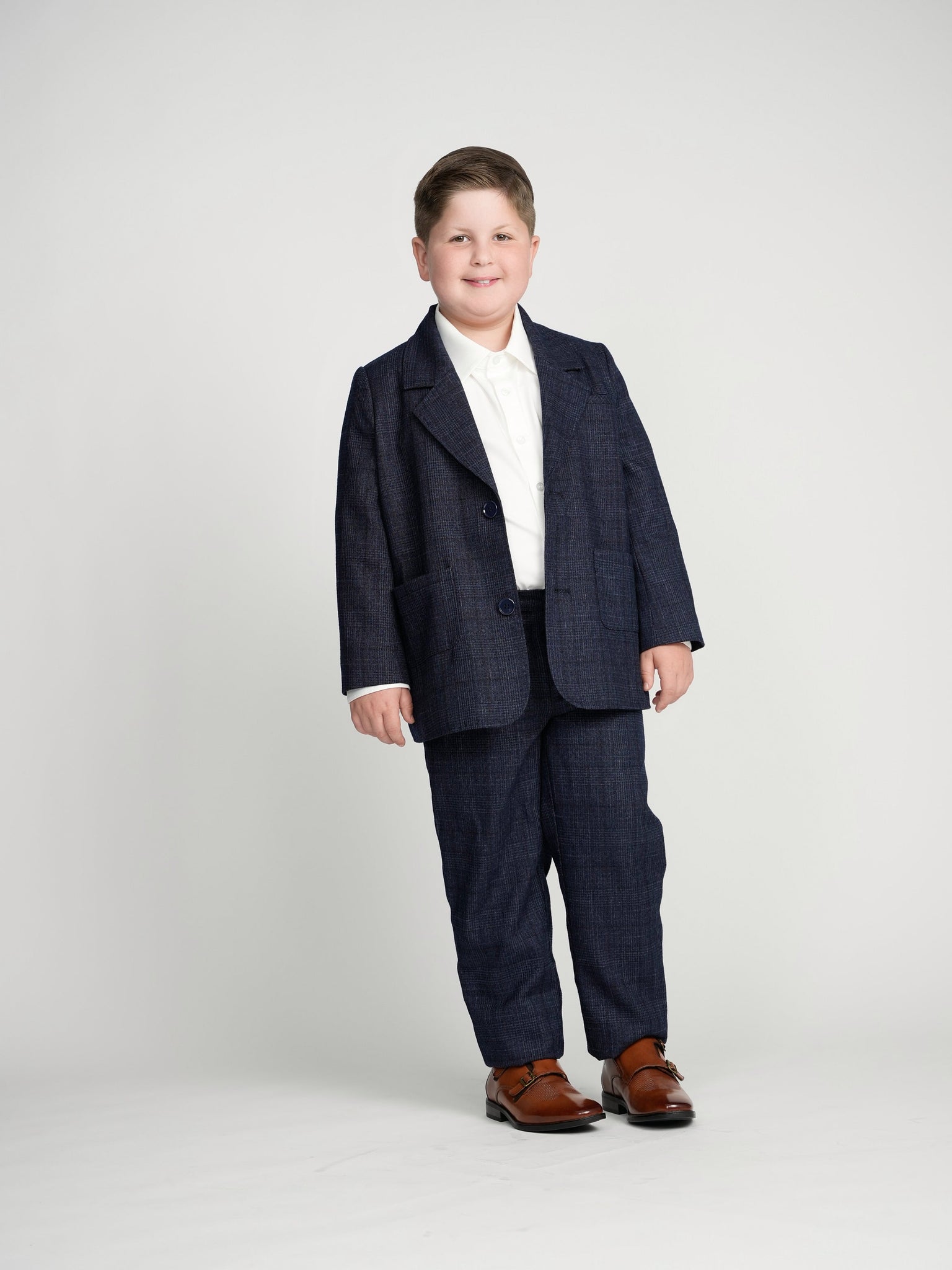Our navy glen plaid blazer for boys makes sure that every boy feels confident and comfortable. This blazer features a classic lapel, single slit back, custom Mofi lining and outside pockets to store all your goodies.