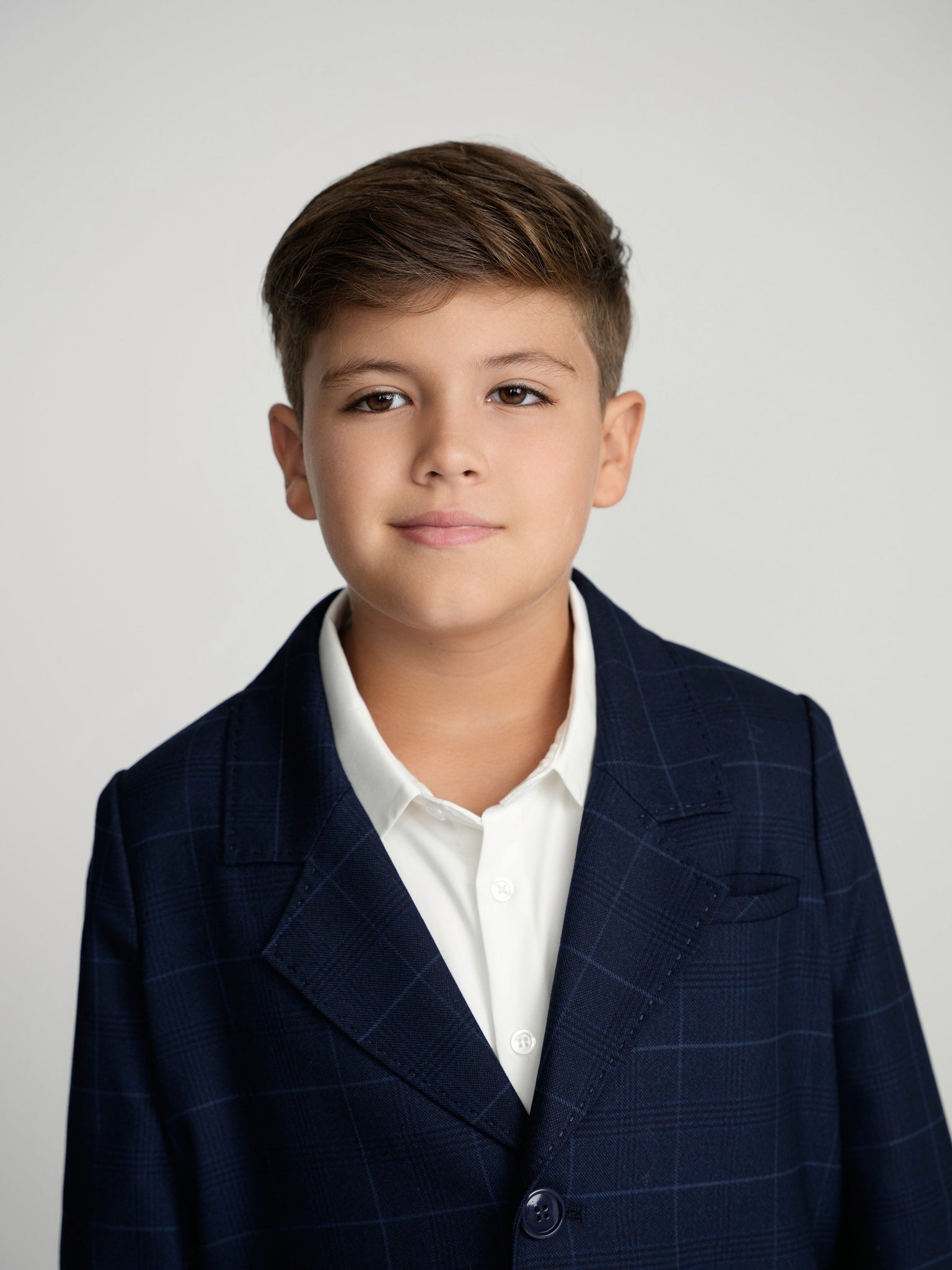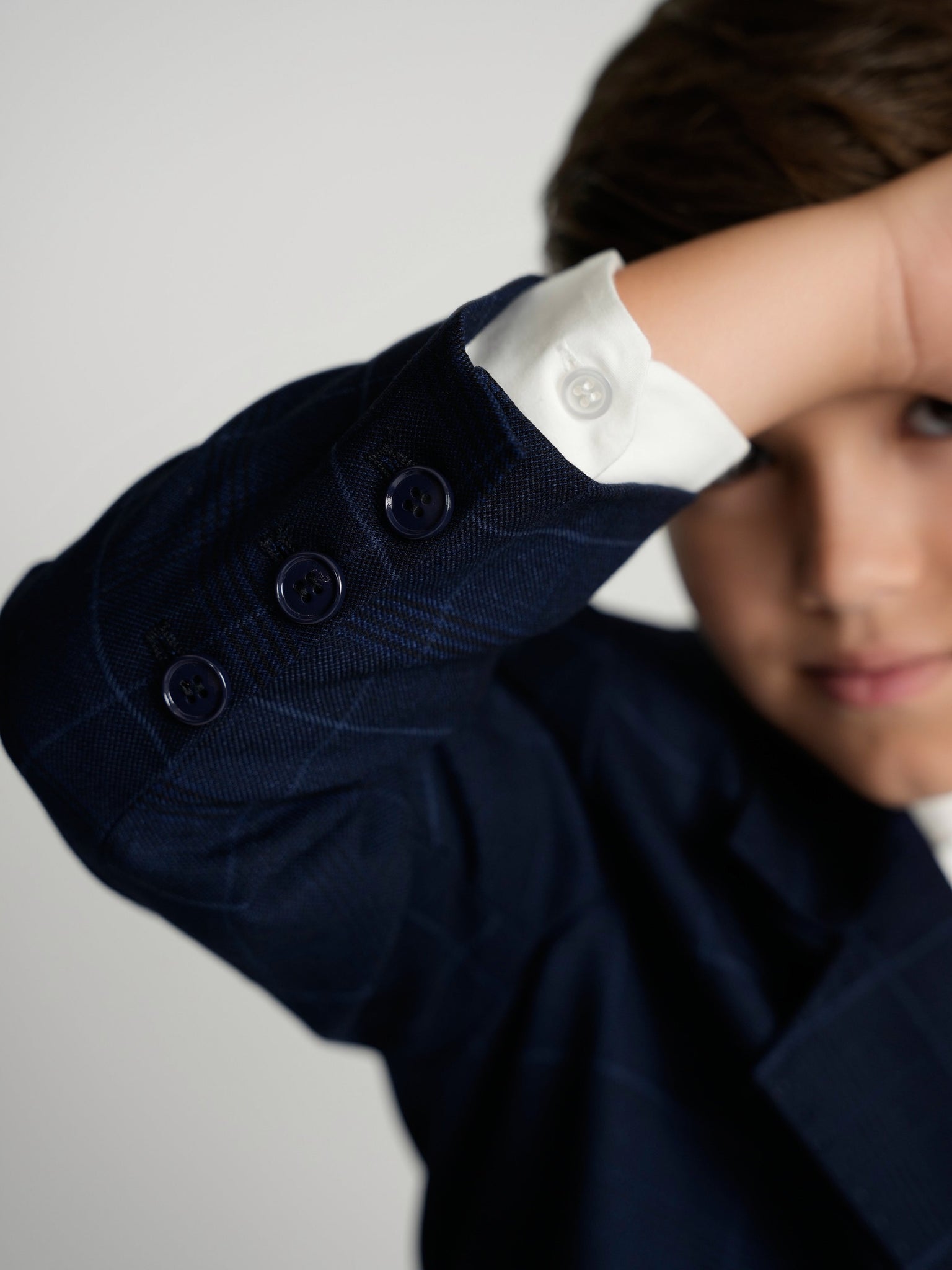 Our tailored navy plaid windowpane blazer for boys makes sure that every boy feels confident and comfortable. With a classic label, Mofi custom lining, single slit in back and front pockets for collecting goodies.