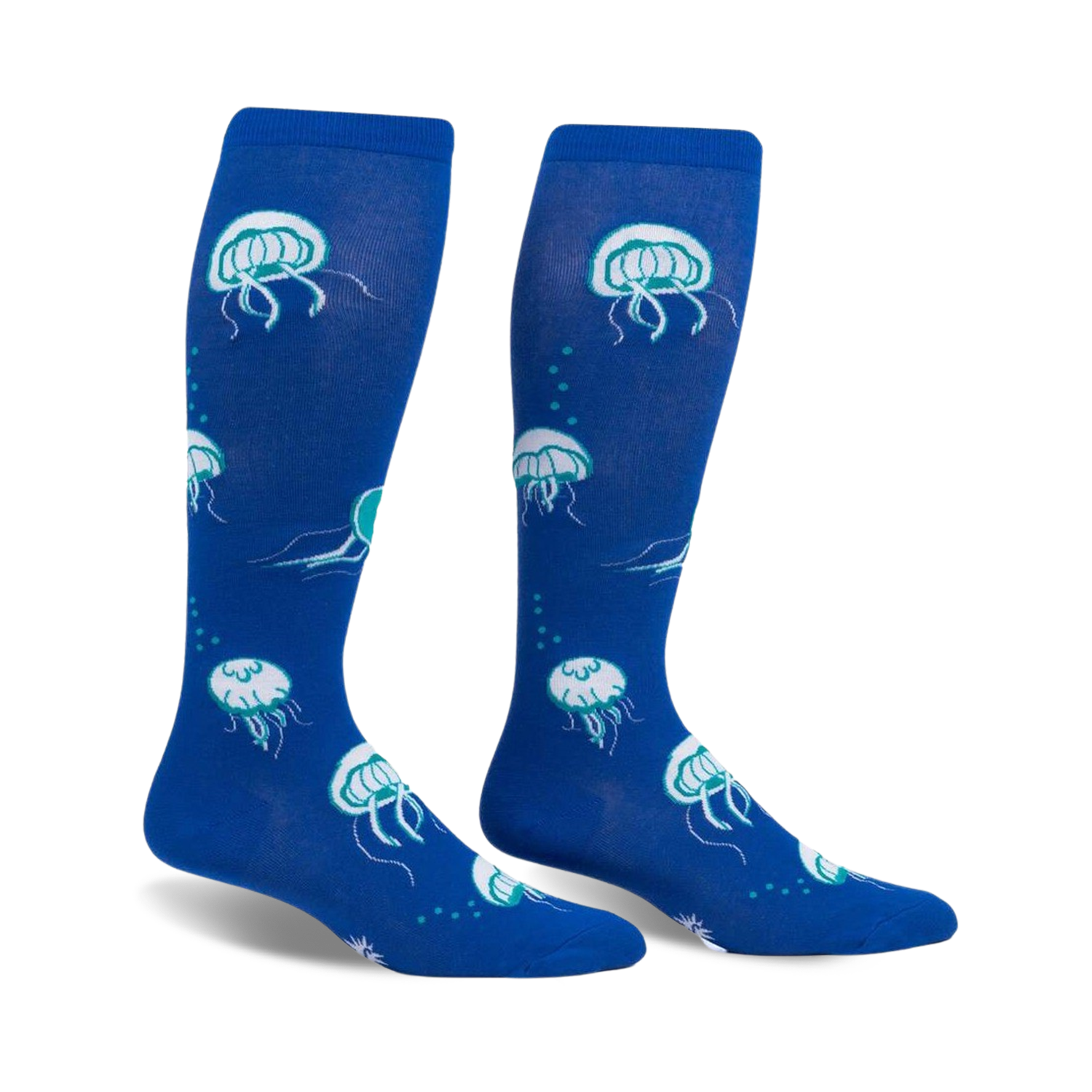 Dive into nautical bliss with our Nice to Sea You knee-high socks! Featuring a delightful all-over pattern of jellyfish in white with green and blue accents on a baby blue background, these socks will make a splash wherever you go. Perfect for men and women with wide calves, these socks bring a touch of marine magic to your wardrobe. From pool parties to beachy getaways, these socks are sure to be the catch of the day.!