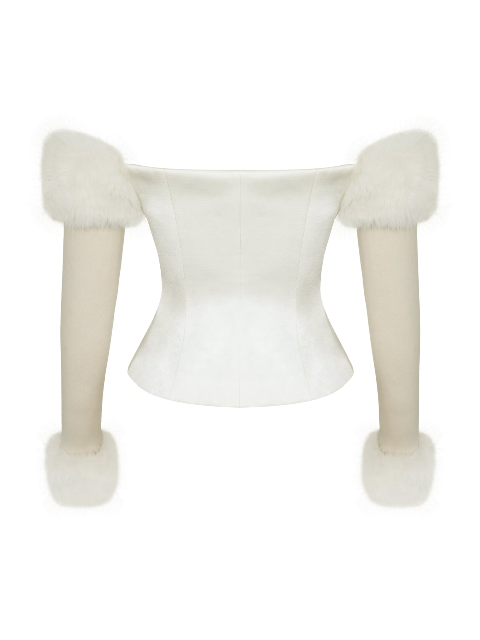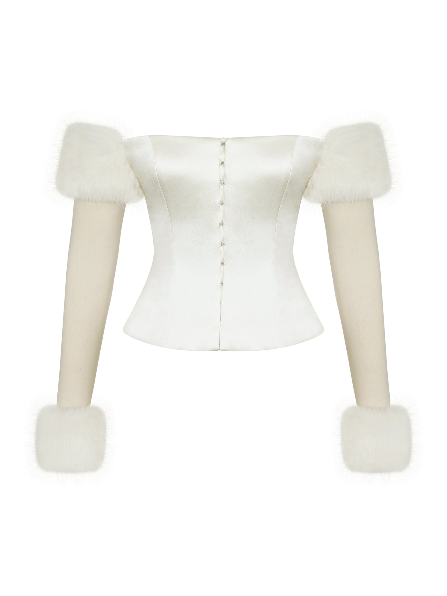 Bring a little après-ski glam to your winter wardrobe with the Nola Top, a playful ivory off-shoulder piece made for cozy-chic moments. Trimmed in plush faux fur at both the neckline and cuffs, it’s the kind of top that looks just as good fireside as it does at a mountain resort dinner. The mesh sleeves add a flirty sheer touch, while internal boning keeps the fit structured and secure. A front hook-and-eye closure gives it a hint of vintage charm, and the satin lining feels as smooth as fresh snow. Pair it with the matching Narla Skirt for a head-turning set that’s equal parts snow bunny and style icon.
