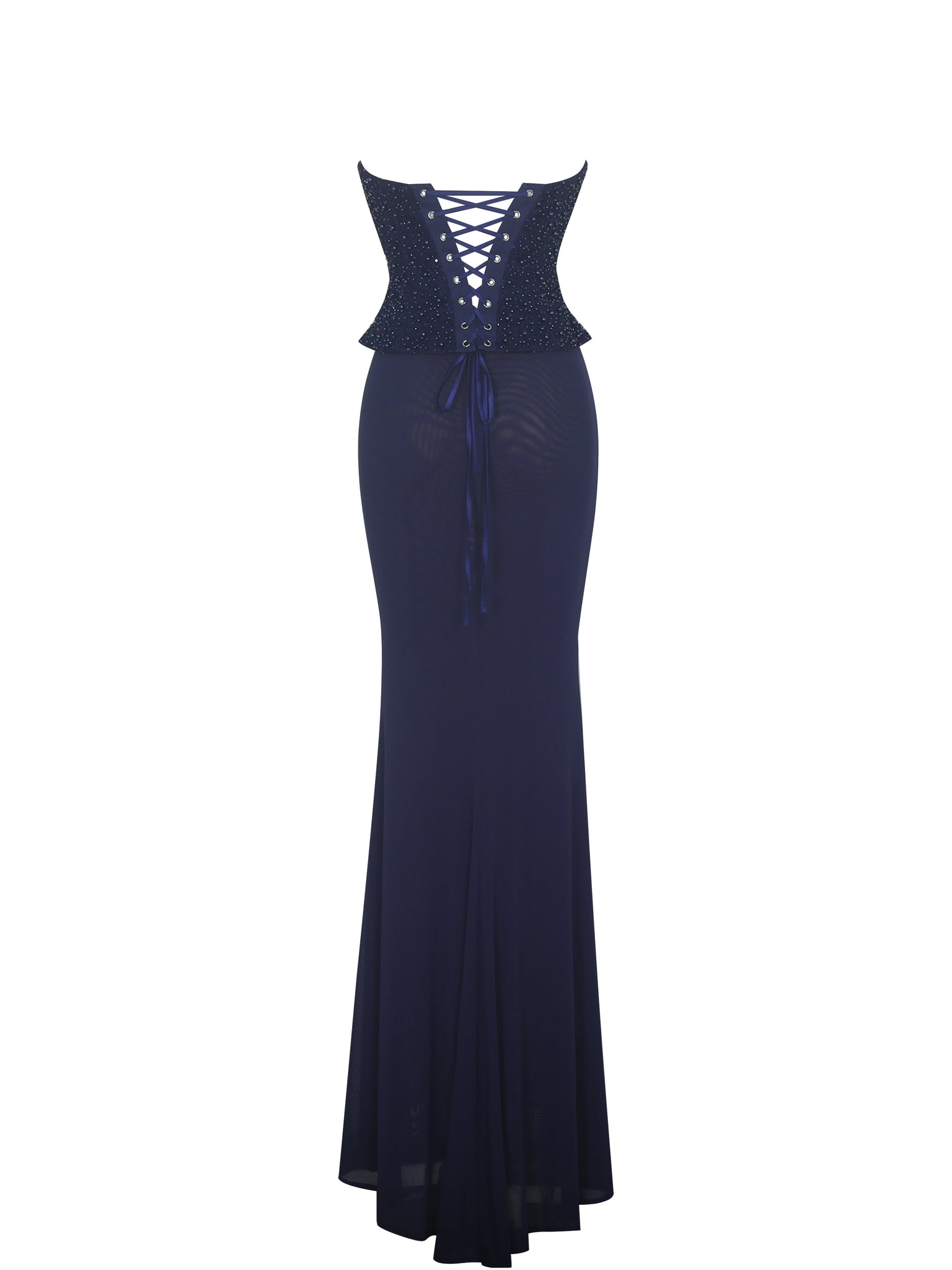 The Orabelle Dress dazzles as a faux two-piece, with a sculpted peplum top in deep navy double duchess satin adorned with intricate beading that twinkles like a starry night sky. Beneath the shimmer, a built-in corset with non-slip grip and precisely placed princess seams ensure flawless structure and support, while a lace-up eyelet back allows for a perfectly tailored fit. From the waist, a fully lined, double-layered mesh skirt skims the hips before flaring into a soft mermaid silhouette that glides with celestial elegance. A luminous beauty, this dress was made for black-tie galas, midnight soirées, and every occasion where glamour meets the night sky. Pair it with our Ora opera gloves to echo the dress’s starry beading and complete the celestial allure.