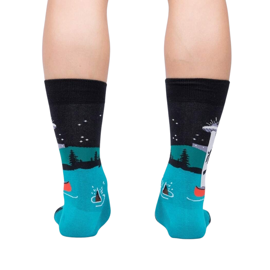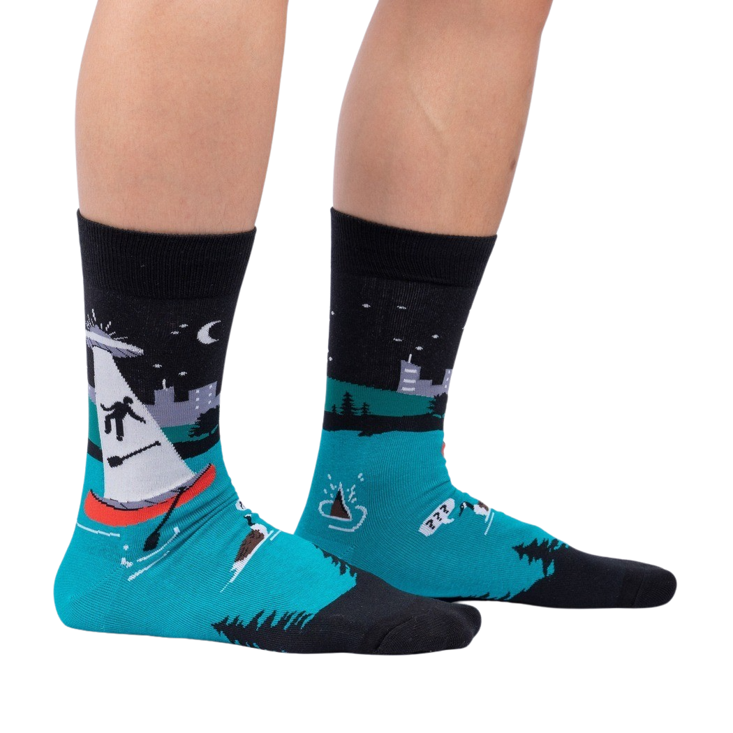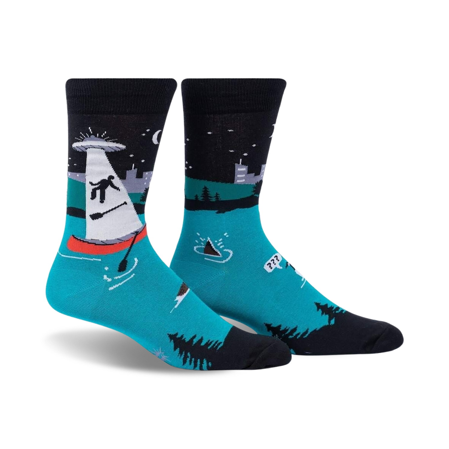 Buckle up for an Out of Boaty Experience with these exhilarating socks! Picture this: a groovy blue canvas adorned with a person on a boat, abducted by curious aliens in a sleek spaceship. Their legs flail, adding a touch of hilarious drama. Embrace the unknown and let these socks abduct your style to infinity and beyond.