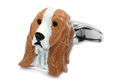 Enhance your look with this cocker spaniel cufflink set. Each of these two dog head cufflinks is hand-painted with a blend of brown and white enamel for a highly realistic looking set. They're attractive to look at and make an interesting accent to your outfit. Wear them with pride on those fun days at work where you can afford to stand out a bit more. This cufflink set also comes in a silver tone color for a more sophisticated look still. These cufflinks are shipped in a leather wrapped gift box that exudes quality and makes the kit look even better overall.