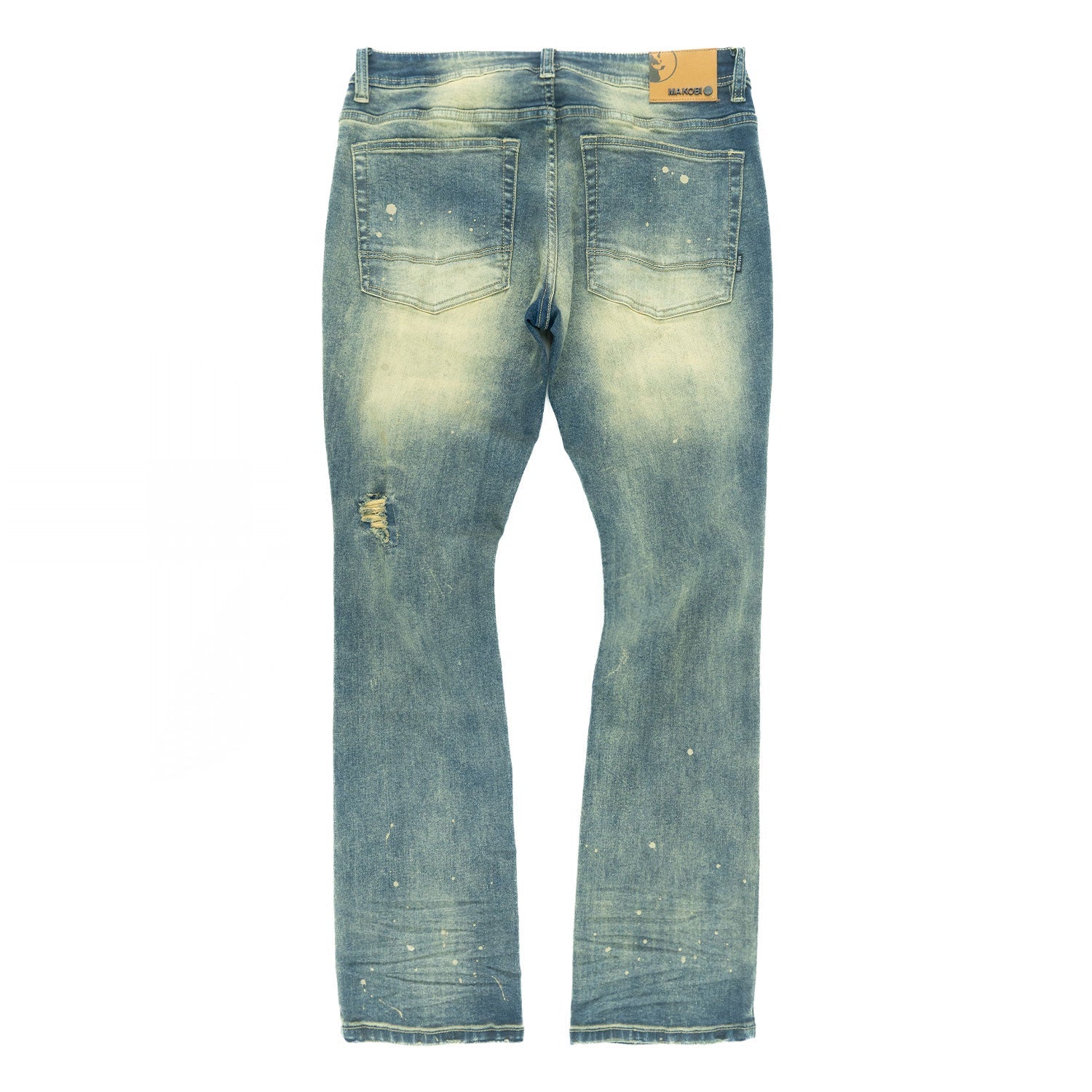 Update to 2026 street style with the MAKOBI M1721 Modena Jeans, crafted for a bold and rugged look. Designed with premium stretch denim, this pair features heavy hand-distressing, ripped details, and layered fabric patches that deliver an authentic worn-in vibe. The light vintage wash is enhanced with paint splatter accents and contrast stitching, giving each pair a unique character. streetwear outfits.