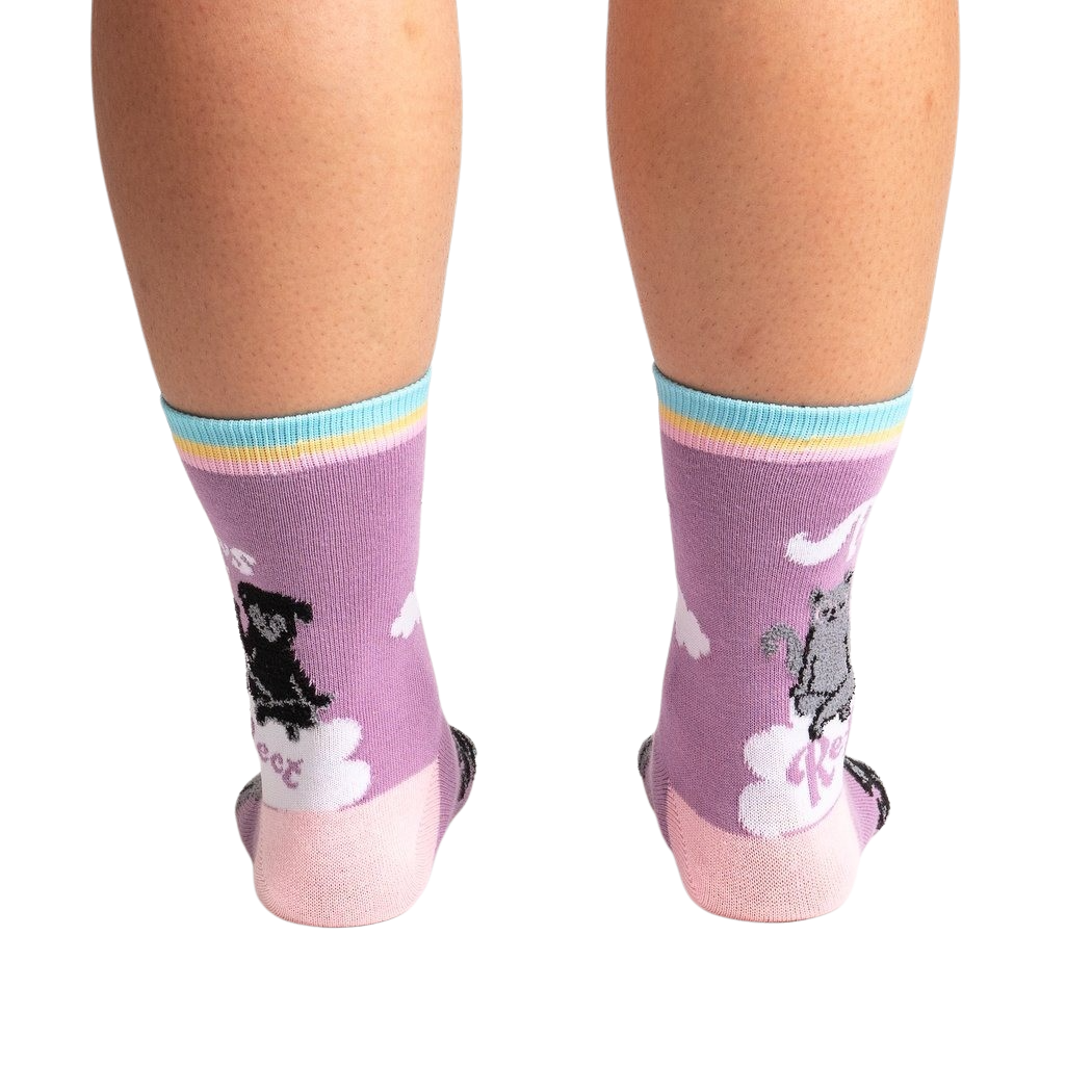 Paws + Reflect socks: Mew-ve over boring socks! These crew socks feature two adorable kitties sitting back-to-back, surrounded by a rainbow, clouds, and the words "Paws + Reflect." They're purr-fect for anyone who loves cats and fun socks. Plus, a portion of the proceeds from each sale goes to help cats in need. Get ready to show off your paws-itive style!