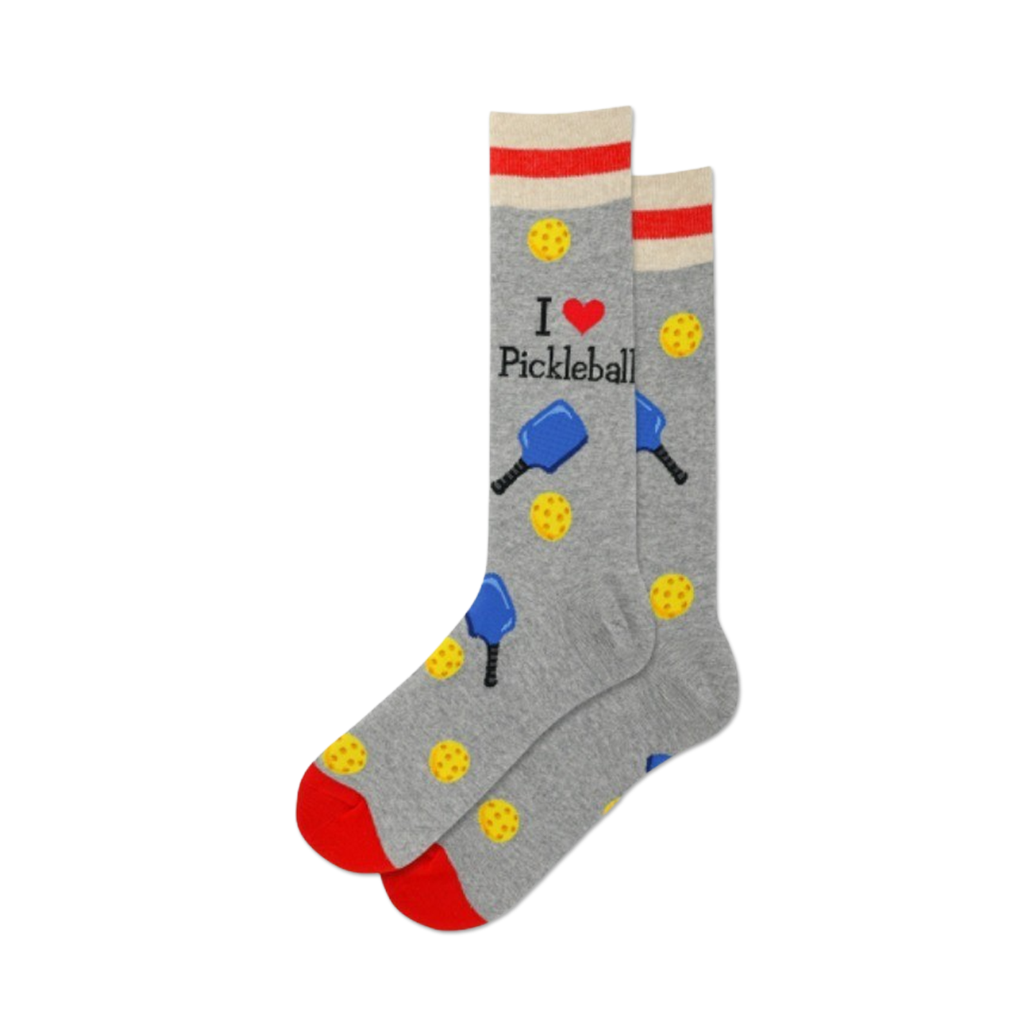 Pickleball. Check. Gray. Check. Red stripe. Check. But wait, there's more! These socks are covered in a delightful pattern of pickleballs and paddles. And just in case anyone missed the memo, they boldly proclaim "I love Pickleball" in big, bright letters. Whether you're a seasoned pro crushing serves or a beginner still learning the ropes, let these socks show the world your passion for the game. Just be warned, they may also inspire impromptu games of pickleball wherever you go!